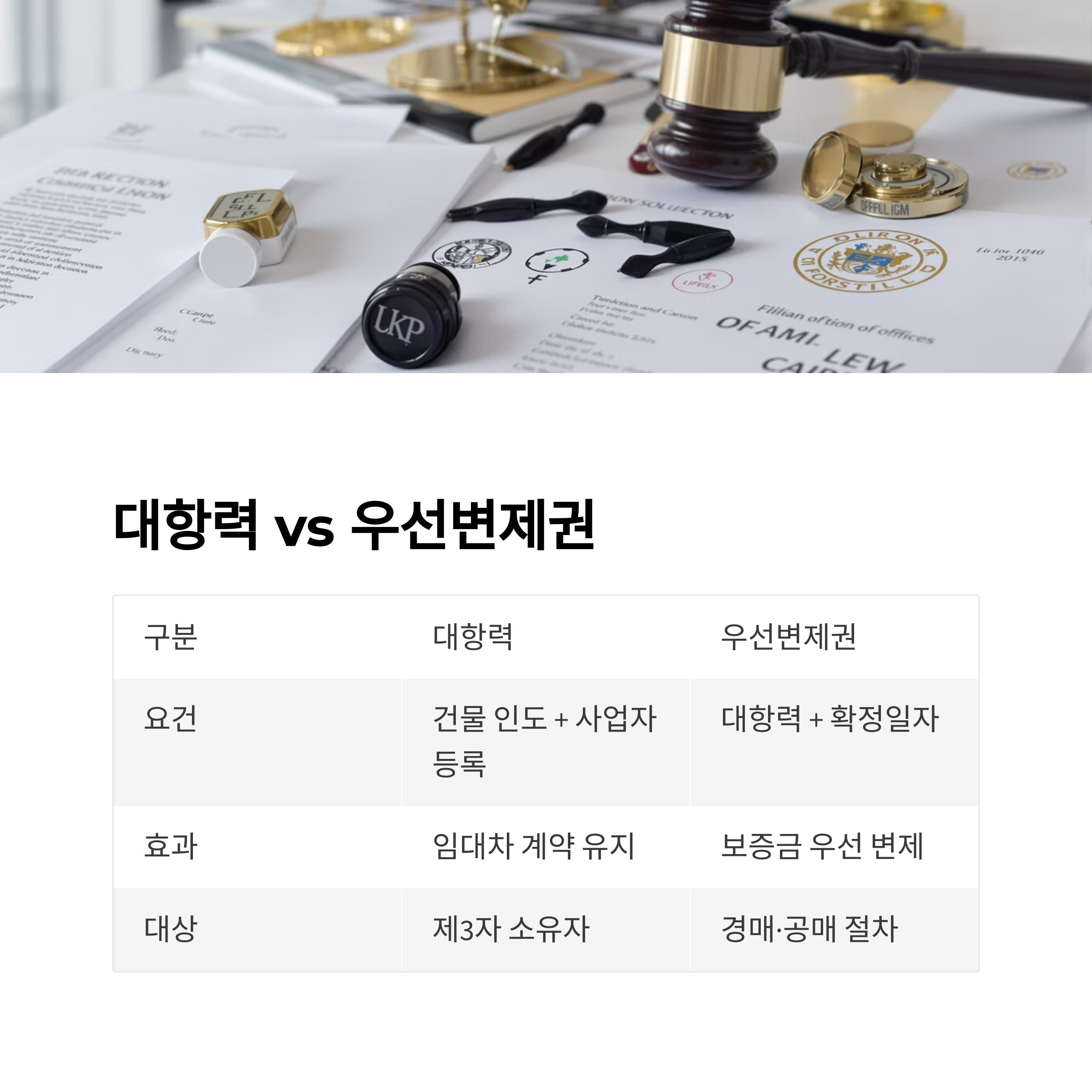 | 핵심 효과 | 임대차 계약의 유지 | 보증금 보호 |