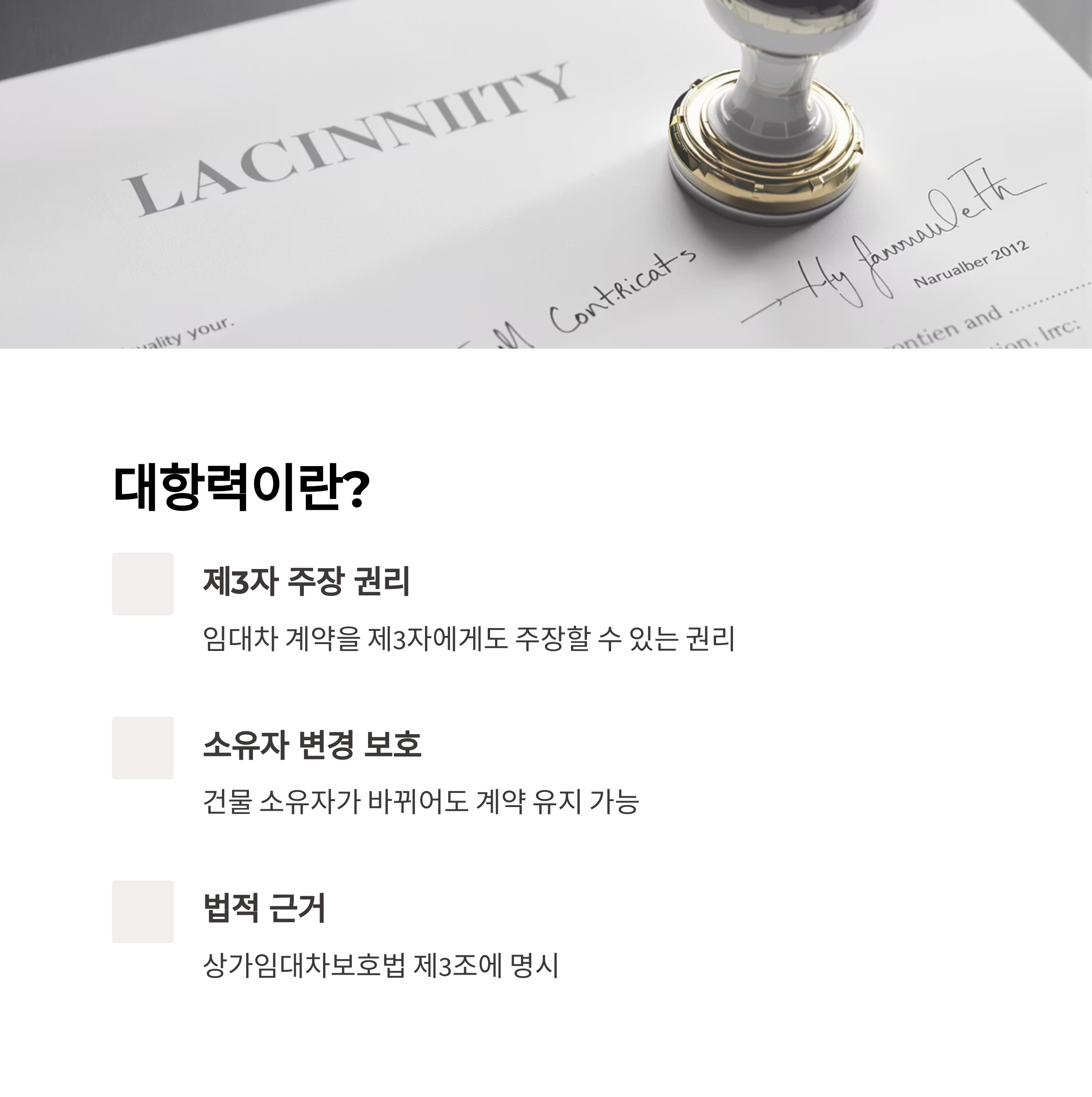 상가 임차인이 법적 보호를 받기 위해서는 일정 요건을 갖추어야 하며, 이를 통해 대항력을 확보할 수 있다. 대항력은 제3자에게 임대차 관계를 주장할 수 있는 권리로, 이를 갖추지 못하면 건물 소유자 변경 시 권리를 상실할 수 있다. 본 글에서는 대항력의 의미, 요건, 확보 방법과 유지 조건까지 실무적으로 필요한 내용을 설명한다.