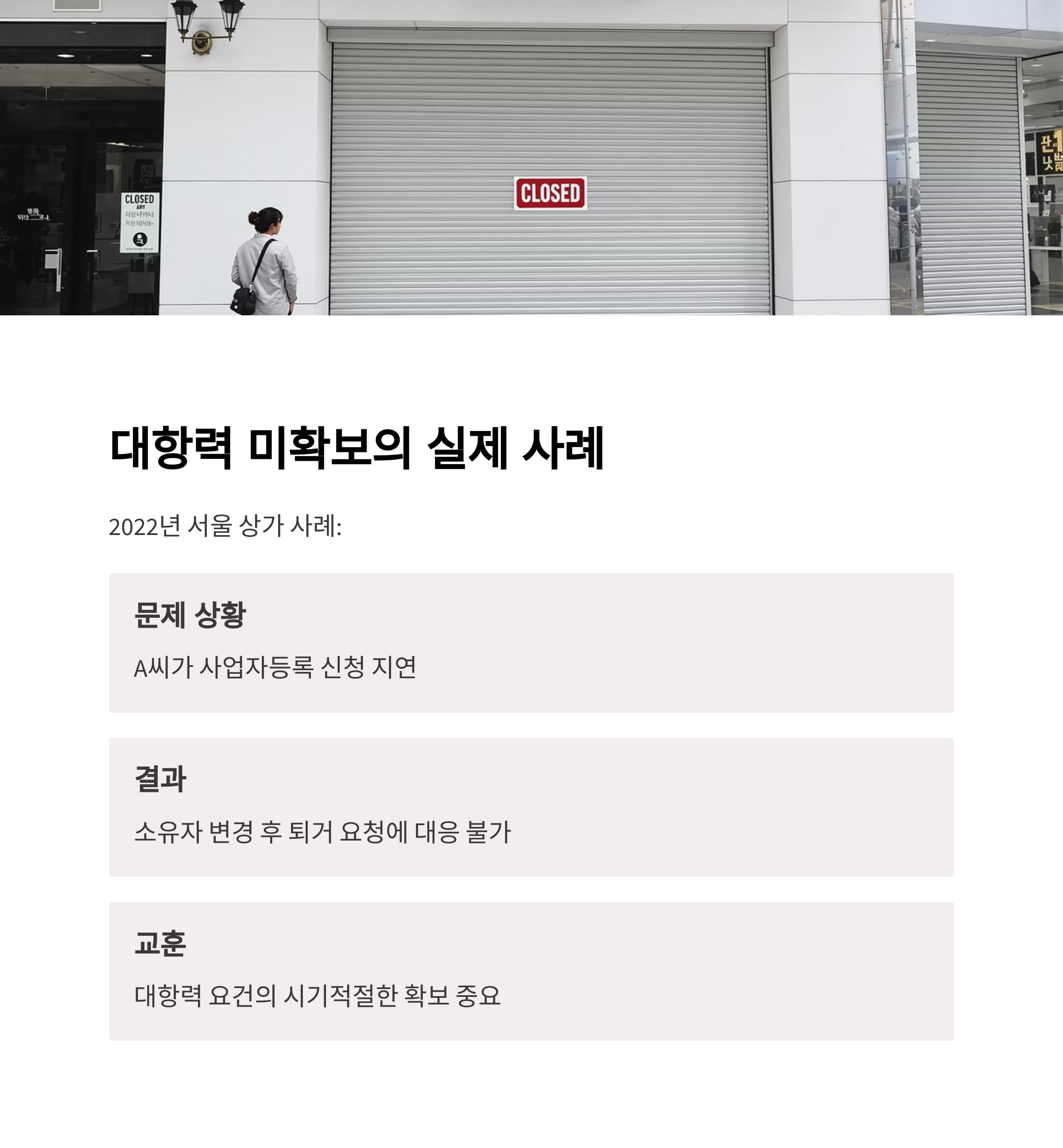 사업자등록 상태를 지속적으로 유지해야 한다. 점유를 상실하거나 폐업 신고를 하면 대항력도 함께 소멸된다.
