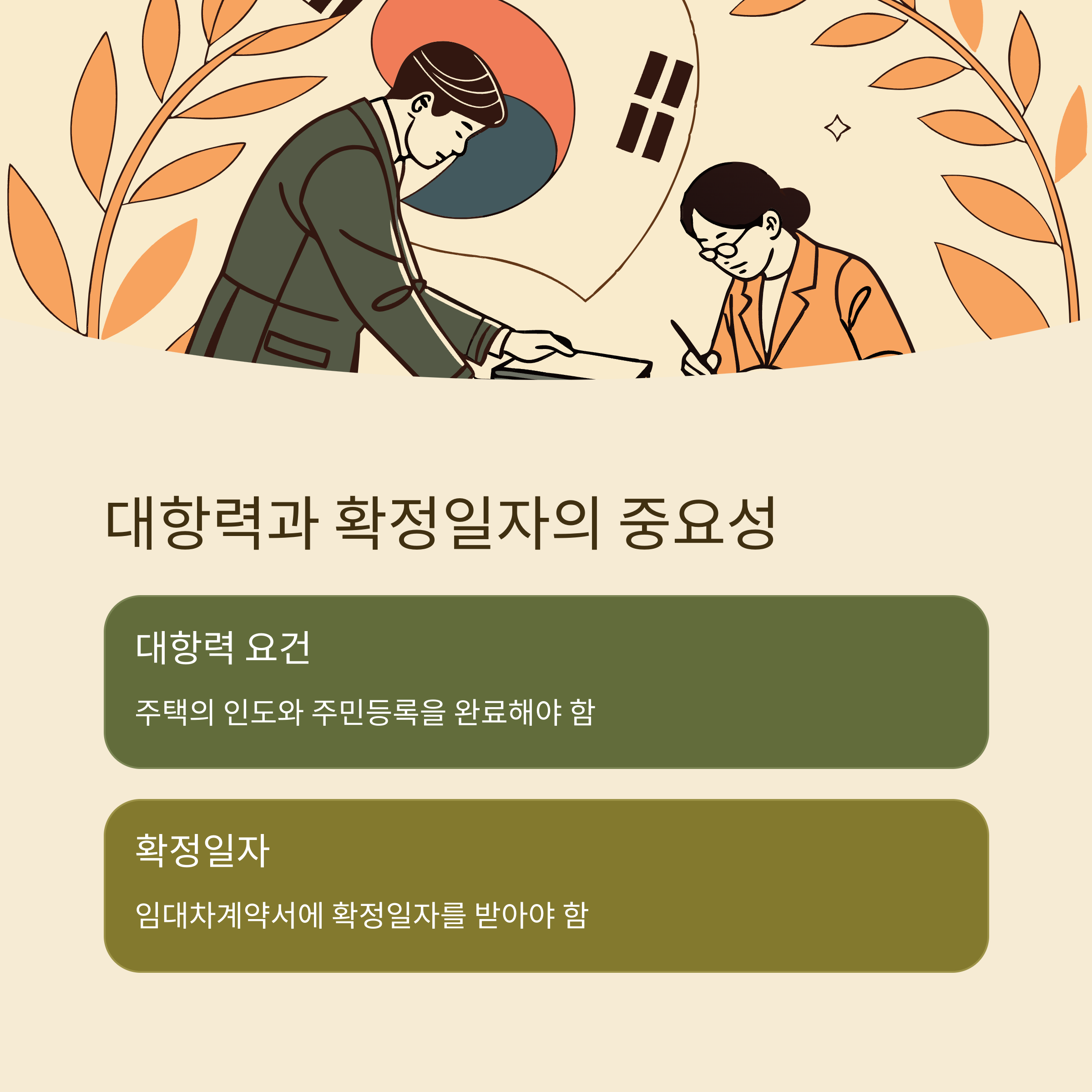 - 대항력 요건: 주택의 인도와 주민등록을 마쳐야 합니다.