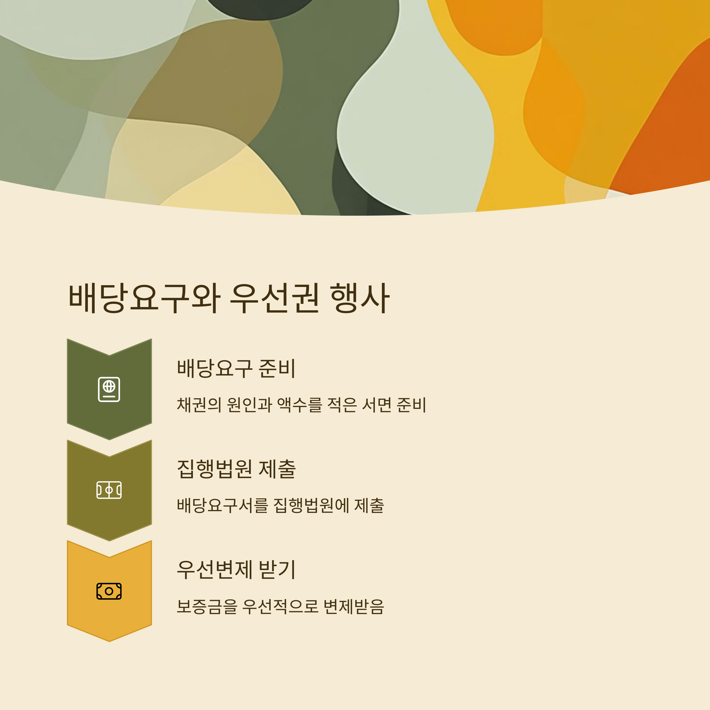 - 배당요구: 집행법원에 채권의 원인과 액수를 적은 서면으로 배당요구를 합니다.
