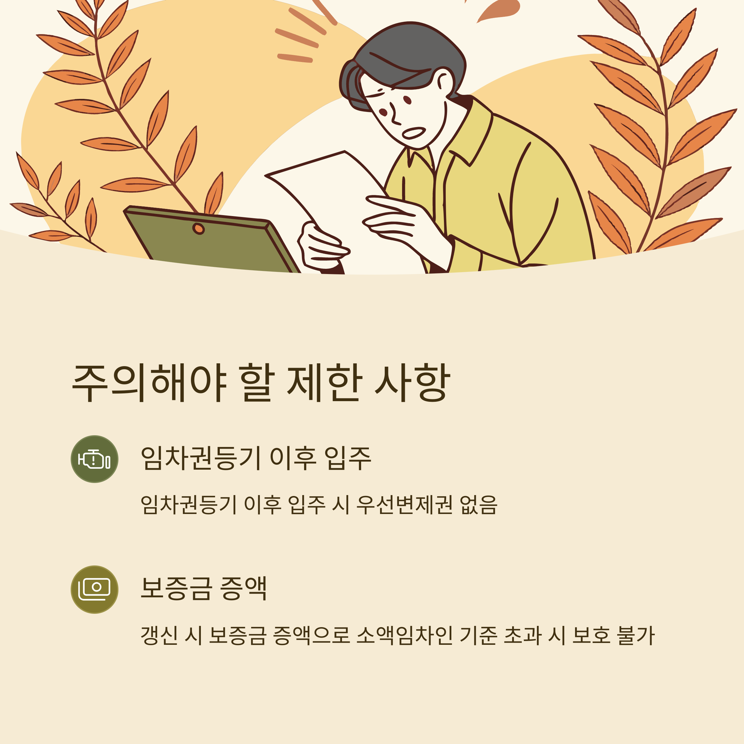 - 보증금 증액 시: 처음 임대차계약을 체결할 때에는 소액임차인에 해당되었지만, 그 후 계약을 갱신하는 과정에서 보증금이 증액되어 소액임차인에 해당하지 않는 경우에는 우선변제권을 행사할 수 없습니다.