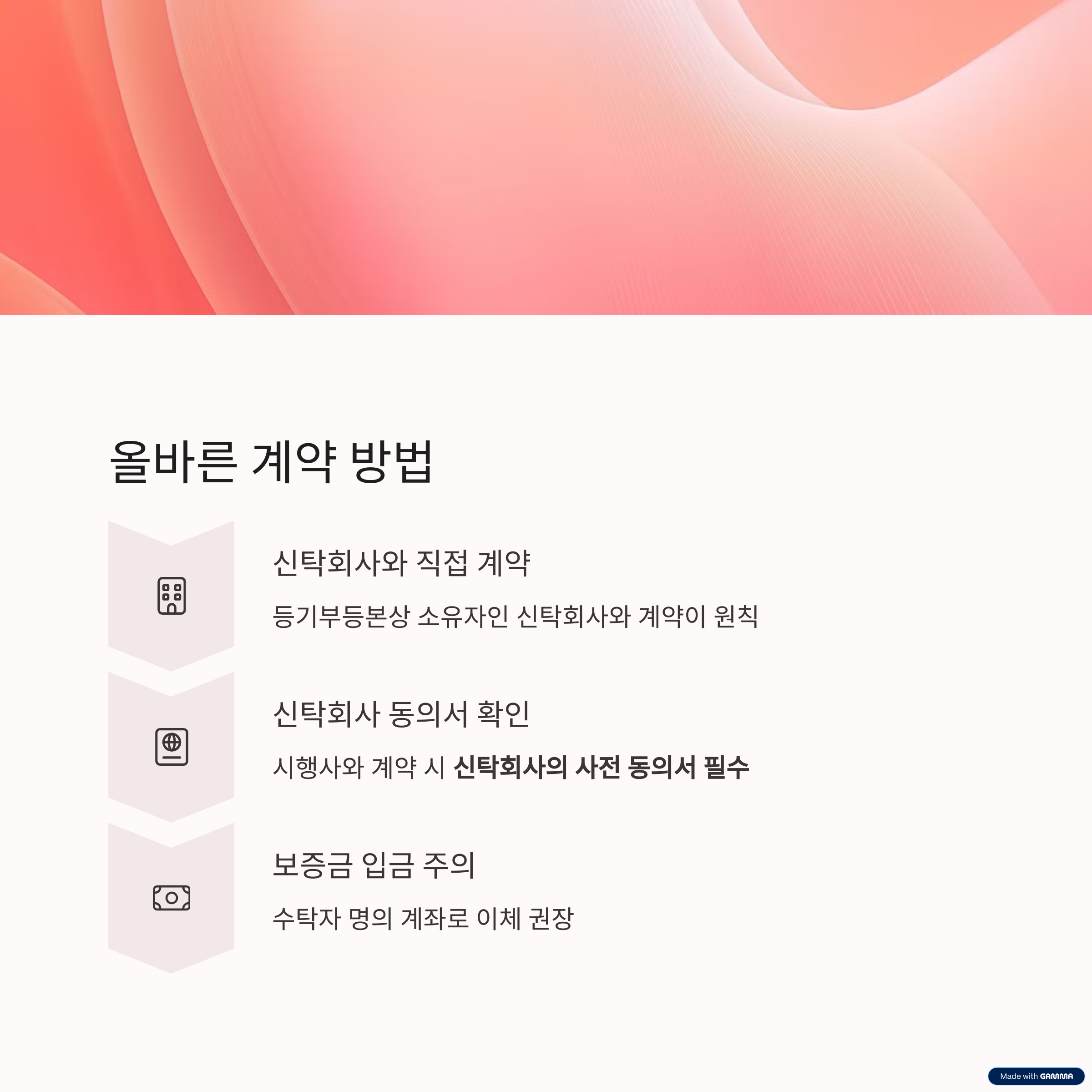 - 보증금 입금 계좌: 수탁자 명의 계좌로 이체 권장
