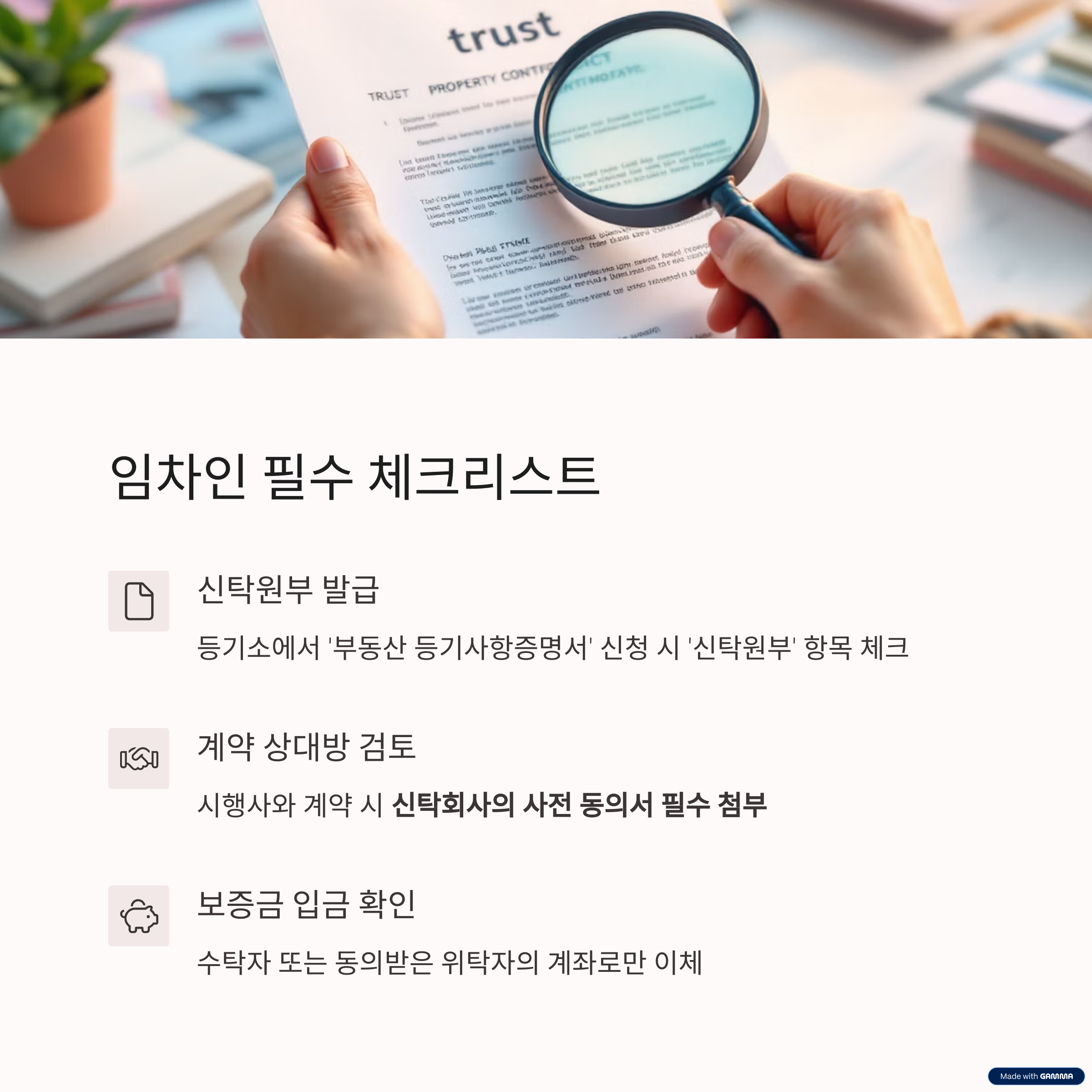 - 신탁원부 확인: 위탁자에게 임대권한이 있는지 검토