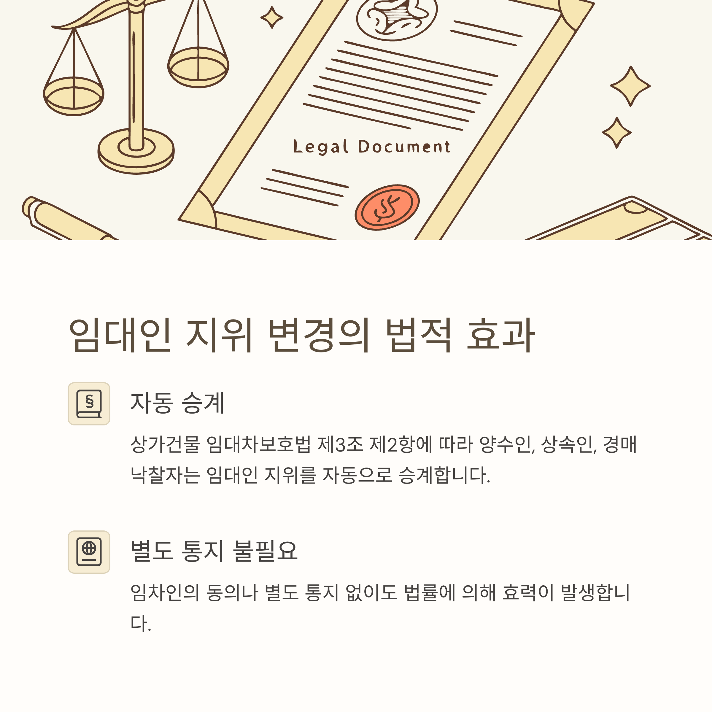 이러한 승계는 법률에 의한 것이므로, 임차인의 동의나 별도의 통지 없이도 효력이 발생합니다.