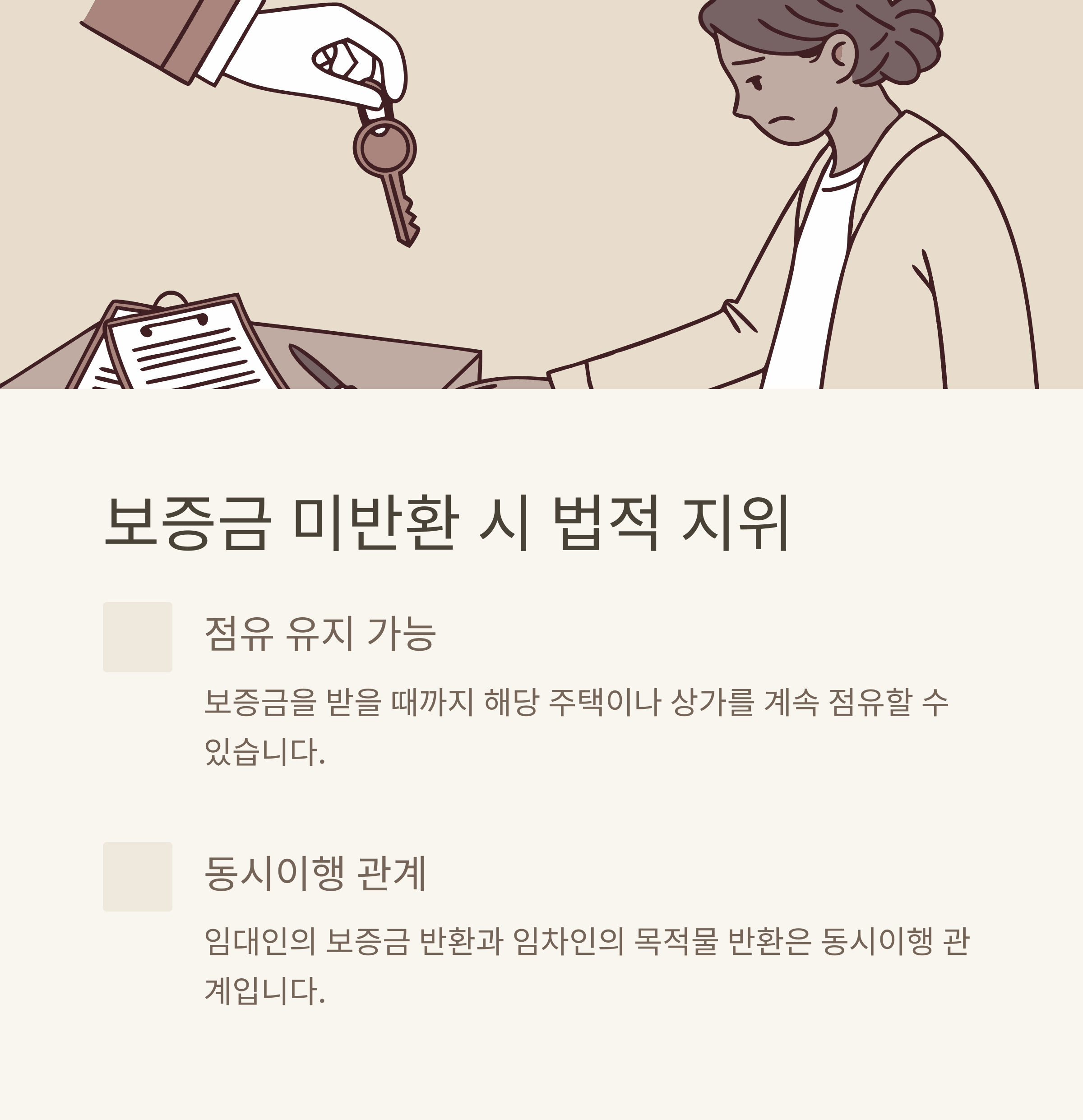임대차 계약이 종료되었음에도 임차인이 보증금을 반환받지 못한 경우, 임차인은 해당 주택이나 상가를 인도하지 않고 점유할 수 있습니다. 이는 임대인의 보증금 반환 의무와 임차인의 목적물 반환 의무가 동시이행 관계에 있기 때문입니다. 따라서 임차인은 보증금을 반환받을 때까지 해당 공간을 점유할 수 있으며, 이 기간 동안 임대차 계약상의 권리와 의무가 계속 유지됩니다.