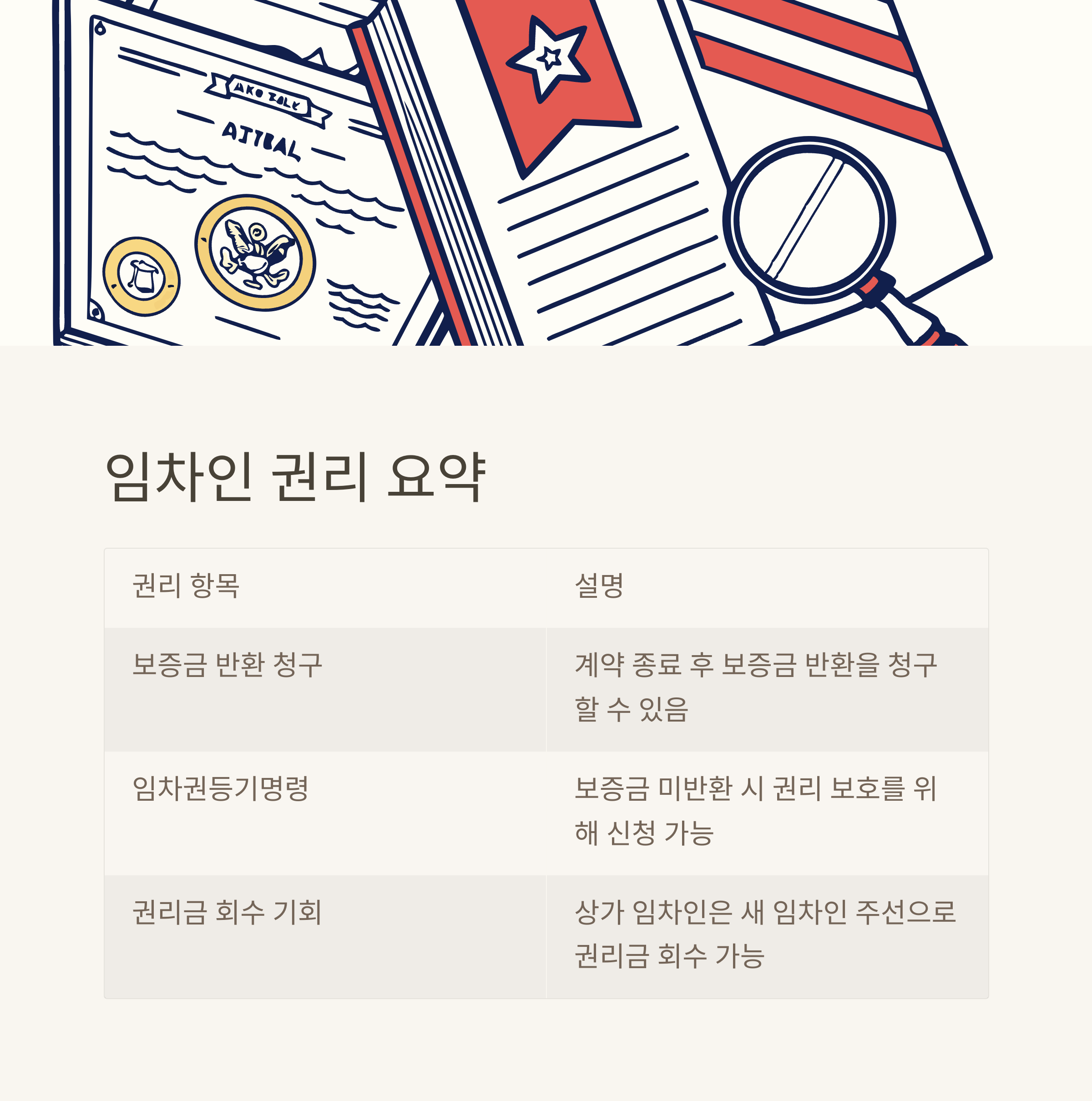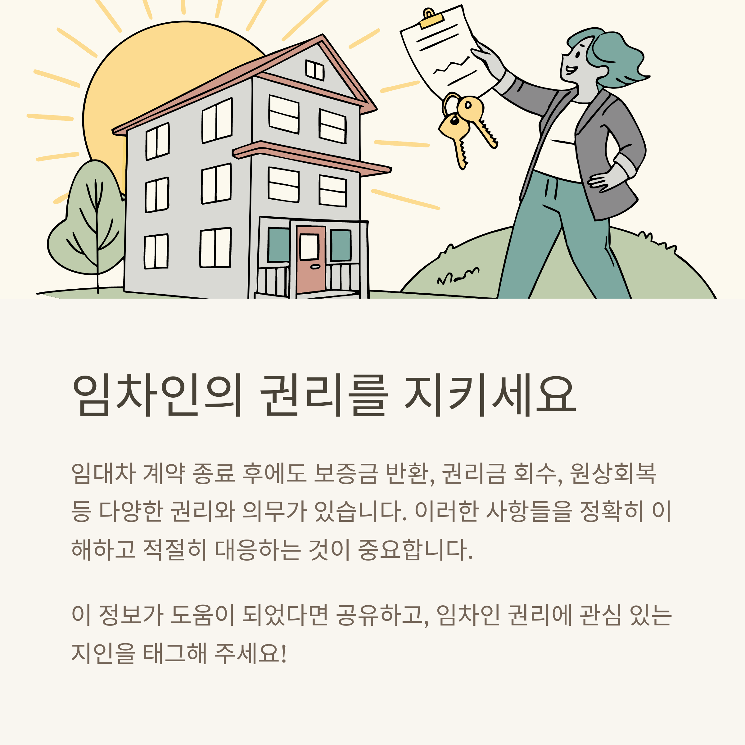 임차인은 임대차 계약 종료 후에도 보증금 반환, 권리금 회수, 원상회복 등 다양한 권리와 의무가 존재합니다. 이러한 사항들을 정확히 이해하고 적절히 대응하는 것이 중요합니다.