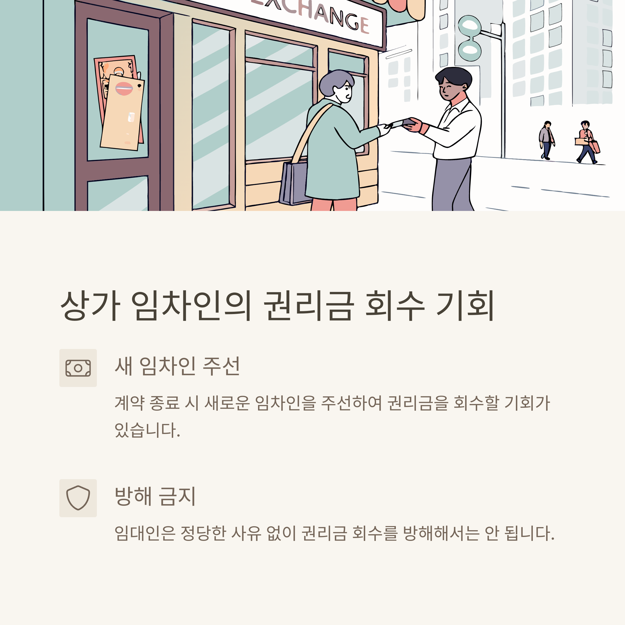 | 권리금 회수 기회 보장 | 상가 임차인의 경우, 새로운 임차인을 주선하여 권리금을 회수할 기회를 가질 수 있습니다. |
