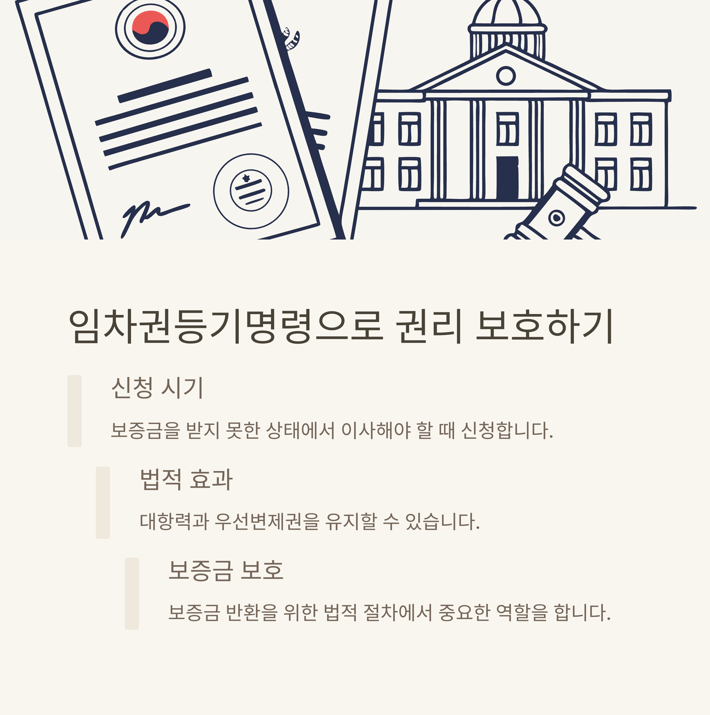 임차인이 보증금을 반환받지 못한 상태에서 이사를 해야 하는 경우, 임차권등기명령을 신청하여 권리를 보호할 수 있습니다. 임차권등기를 마치면 임차인은 대항력과 우선변제권을 유지할 수 있으며, 이는 보증금 반환을 위한 법적 절차에서 중요한 역할을 합니다.