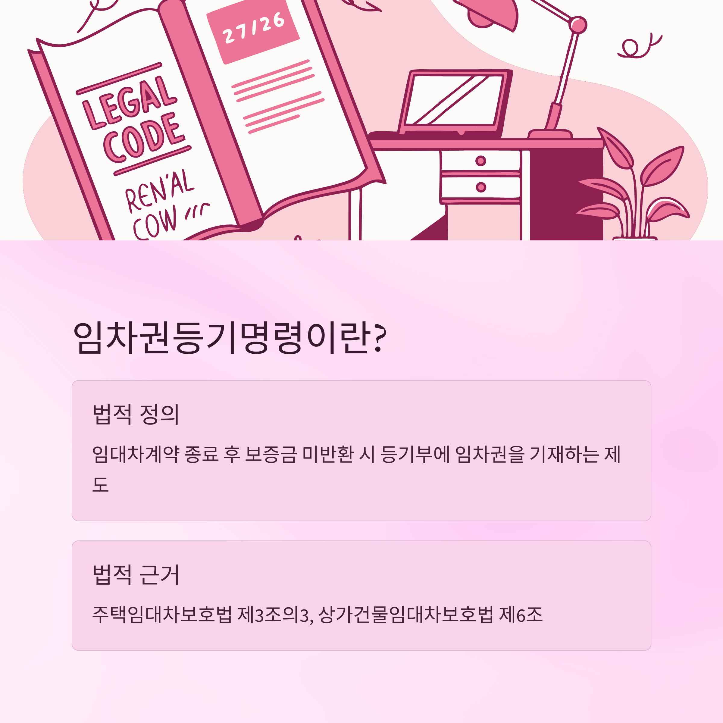 임차권등기명령은 임대차계약이 종료되었음에도 보증금을 반환받지 못한 임차인이 법원에 신청하여 등기부에 임차권을 기재함으로써 대항력과 우선변제권을 유지할 수 있도록 하는 제도입니다. 이 제도는 주택임대차보호법 제3조의3 및 상가건물임대차보호법 제6조에 근거를 두고 있습니다.