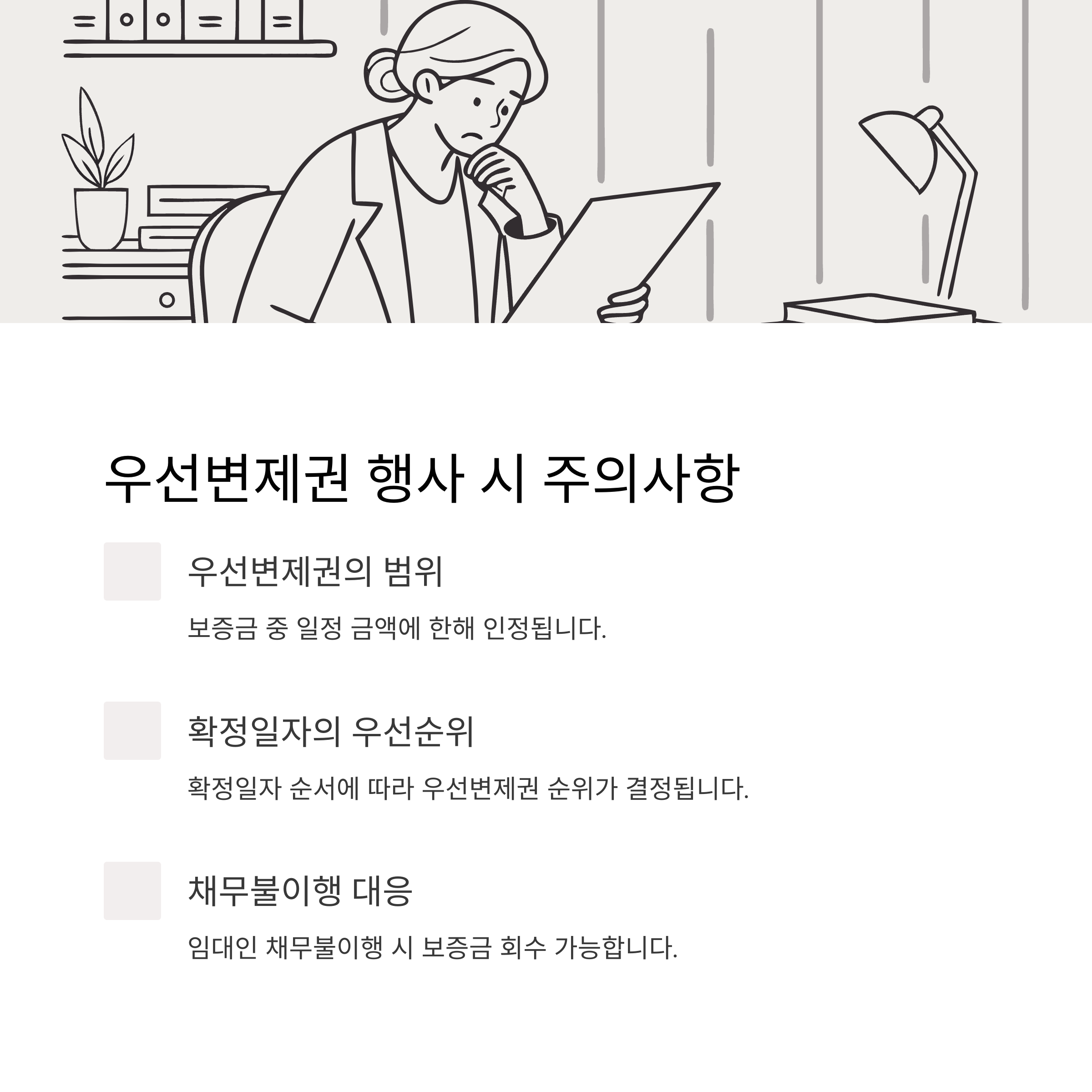 - 임대인의 채무불이행 시: 임대인이 채무를 이행하지 않을 경우, 임차인은 우선변제권을 행사하여 보증금을 회수할 수 있습니다.
