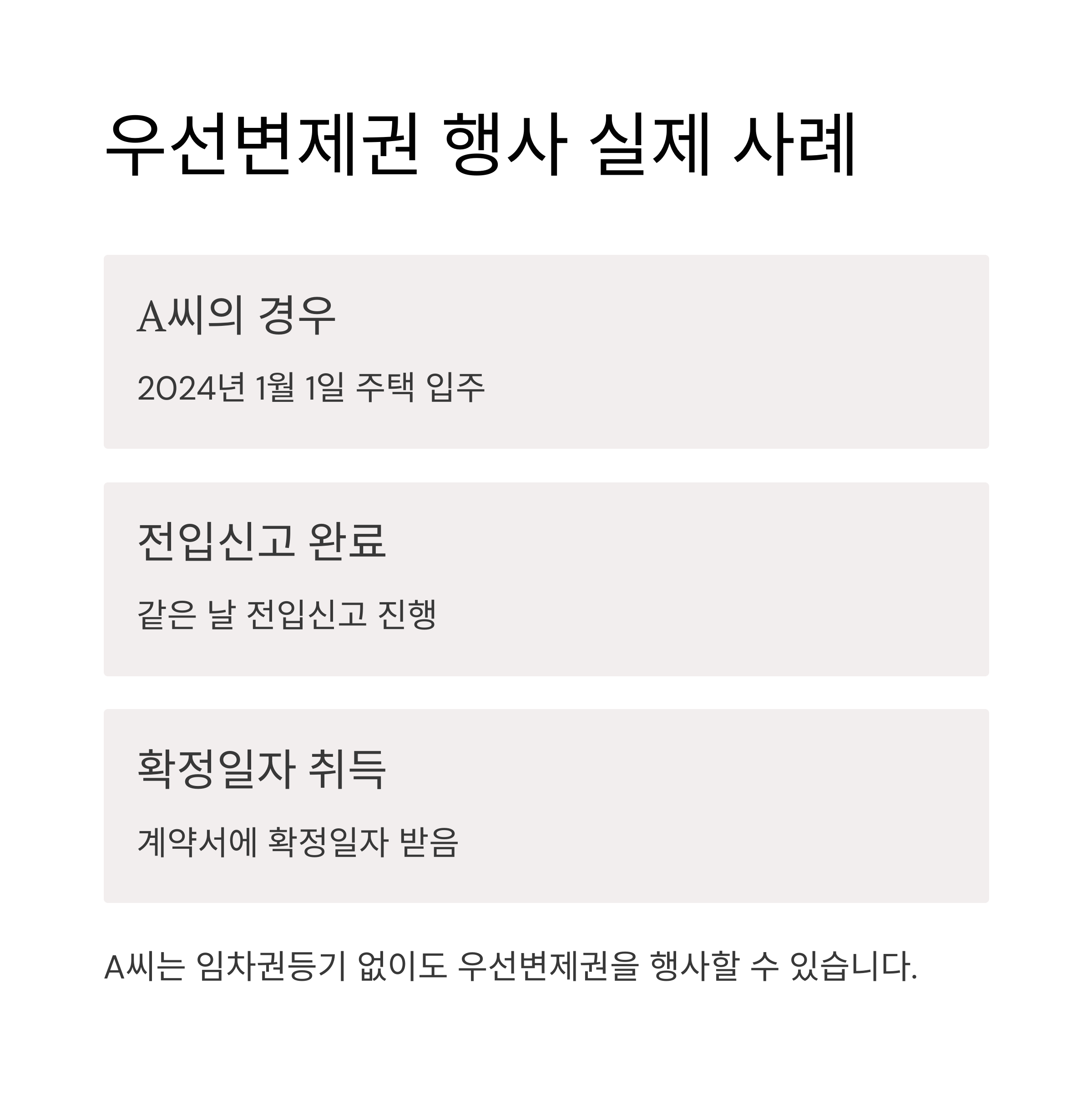 예를 들어, 임차인 A씨는 2024년 1월 1일에 주택에 입주하고 전입신고를 마친 후, 같은 날 임대차계약서에 확정일자를 받았습니다. 이 경우, A씨는 임차권등기 없이도 우선변제권을 행사할 수 있습니다.