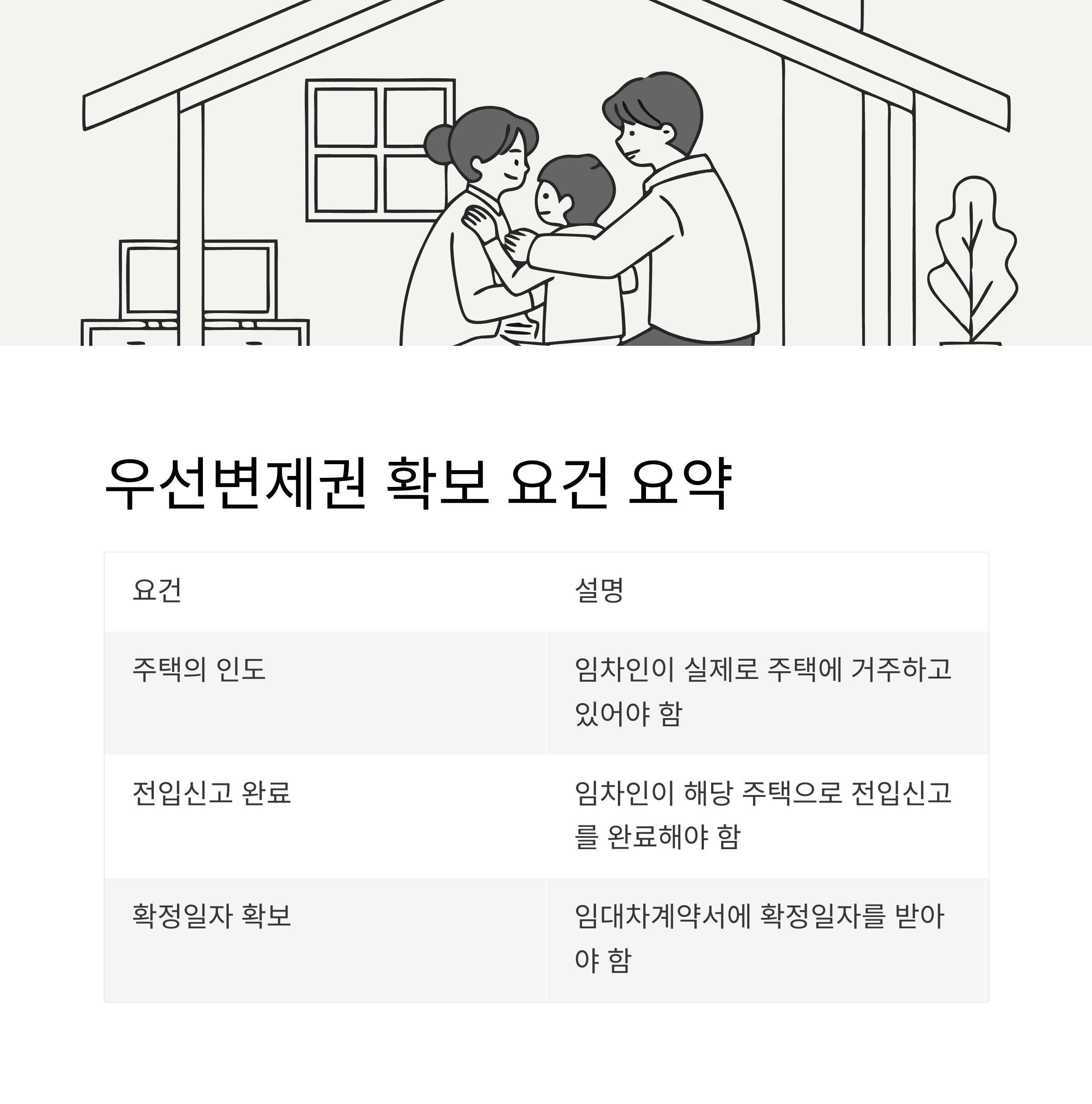 주택임대차보호법에 따르면, 임차인이 우선변제를 받기 위해서는 다음의 요건을 충족해야 합니다: