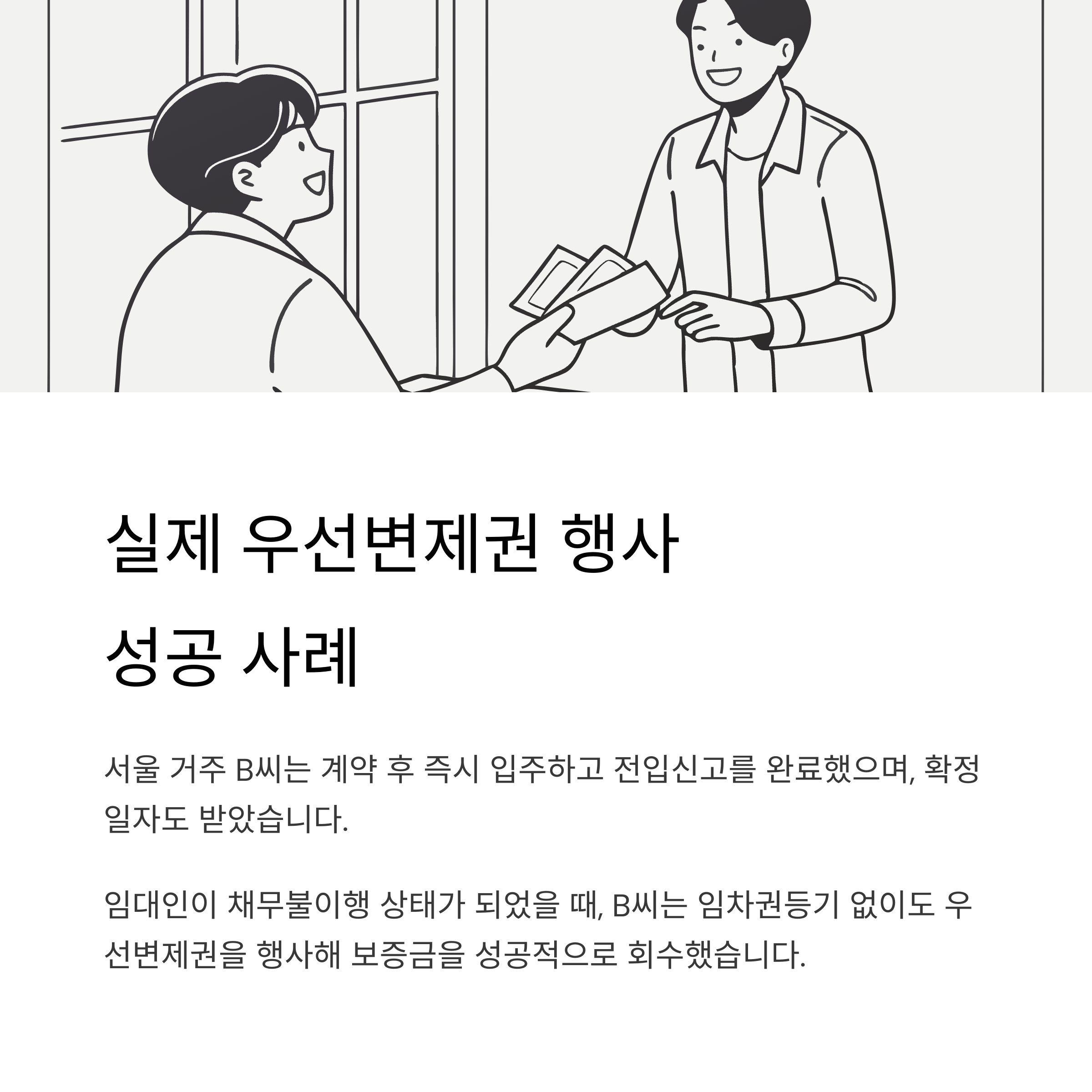 서울에 거주하는 B씨는 임대차계약 체결 후 즉시 주택에 입주하고 전입신고를 완료하였으며, 계약서에 확정일자를 받았습니다. 이후 임대인이 채무불이행 상태에 빠지자, B씨는 임차권등기 없이도 우선변제권을 행사하여 보증금을 회수할 수 있었습니다.