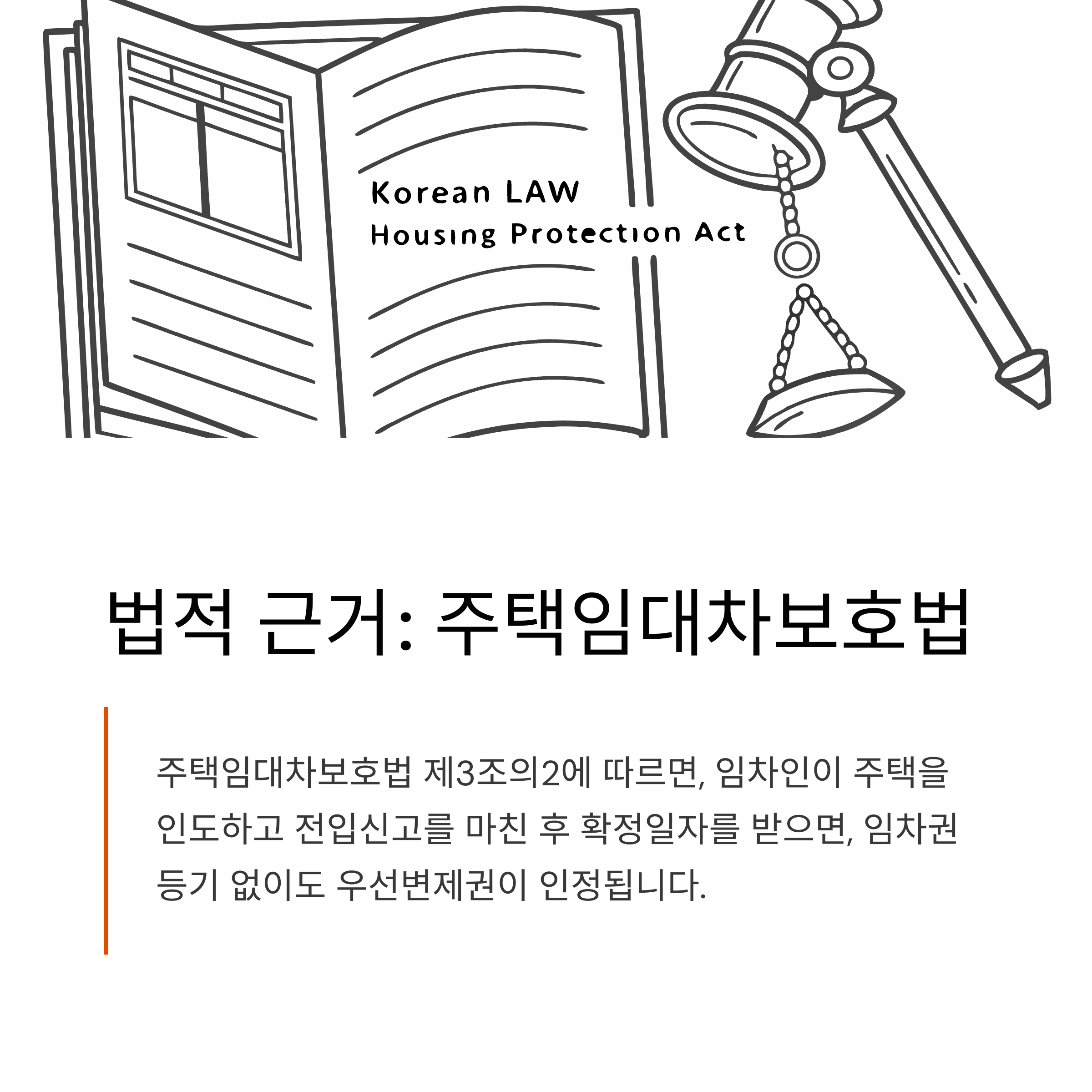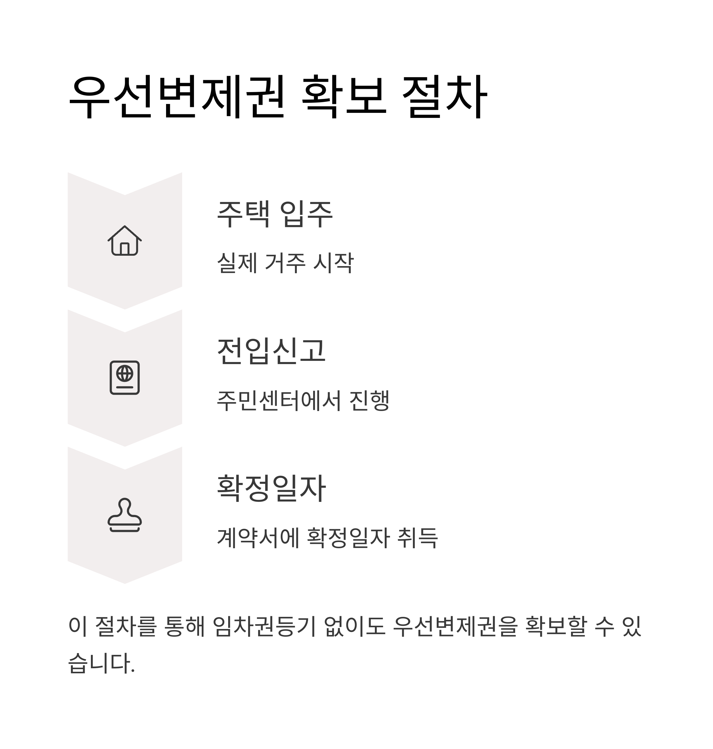 임차인이 주택에 입주하고 전입신고를 마친 후, 임대차계약서에 확정일자를 받으면 임차권등기 없이도 우선변제권을 확보할 수 있습니다. 이는 임차인이 보증금을 회수하는 데 있어 중요한 절차입니다.