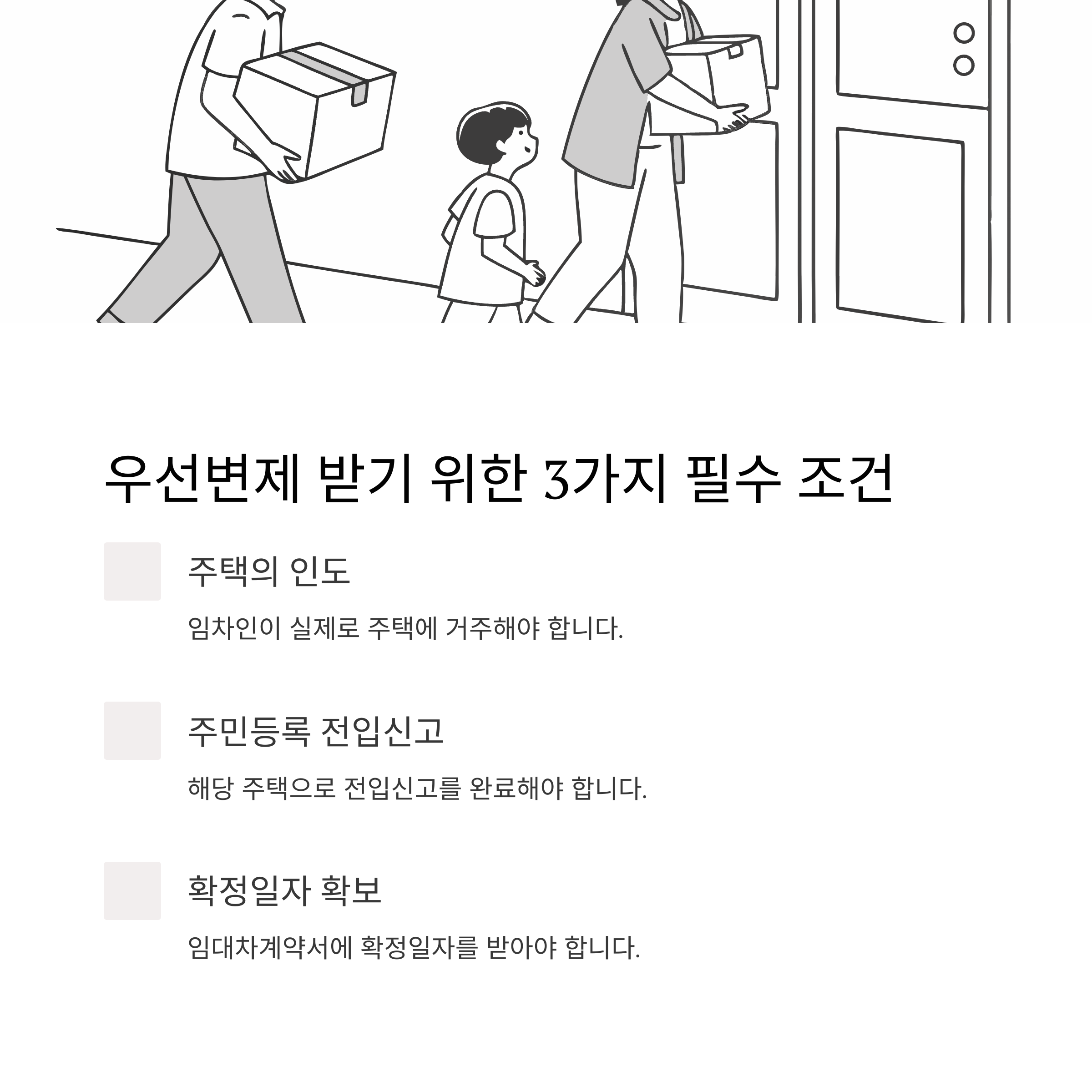 - 주민등록의 전입신고: 임차인이 해당 주택으로 전입신고를 완료해야 합니다.
