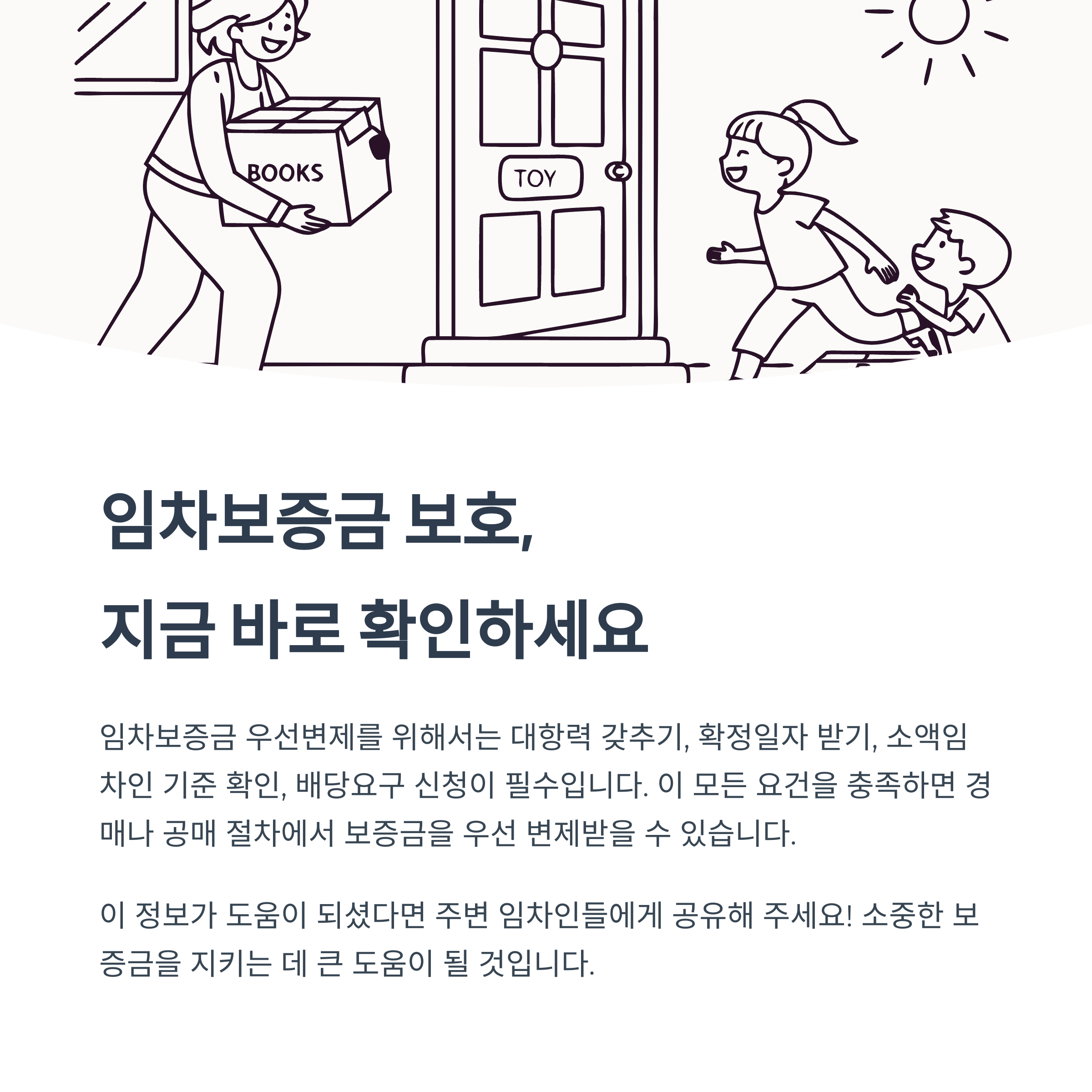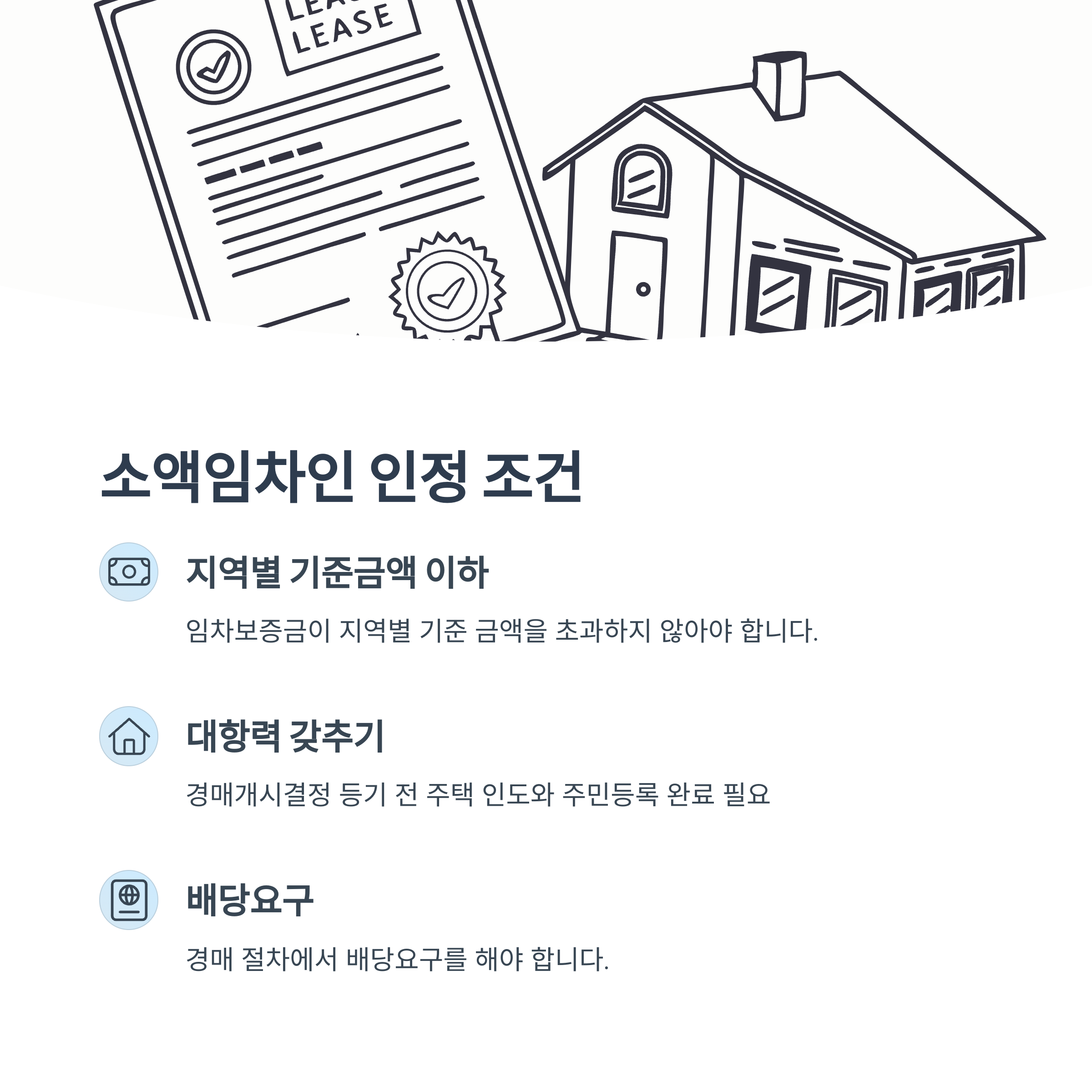 - 임차주택에 대한 경매개시결정 등기 전에 주택의 인도와 주민등록을 완료하여 대항력을 갖추어야 합니다.