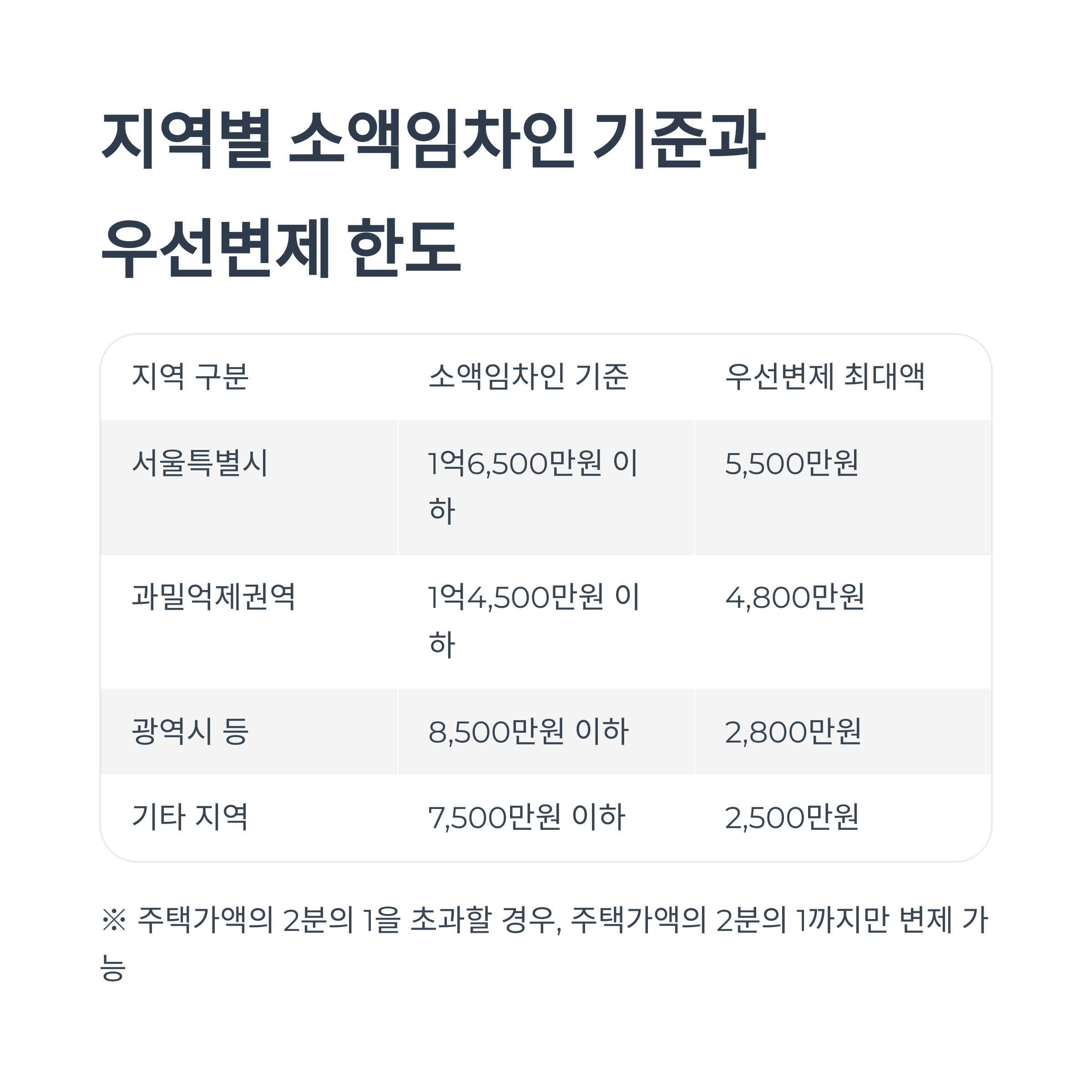 ※ 단, 우선변제 금액이 주택가액의 2분의 1을 초과하는 경우에는 주택가액의 2분의 1에 해당하는 금액까지만 변제받을 수 있습니다.