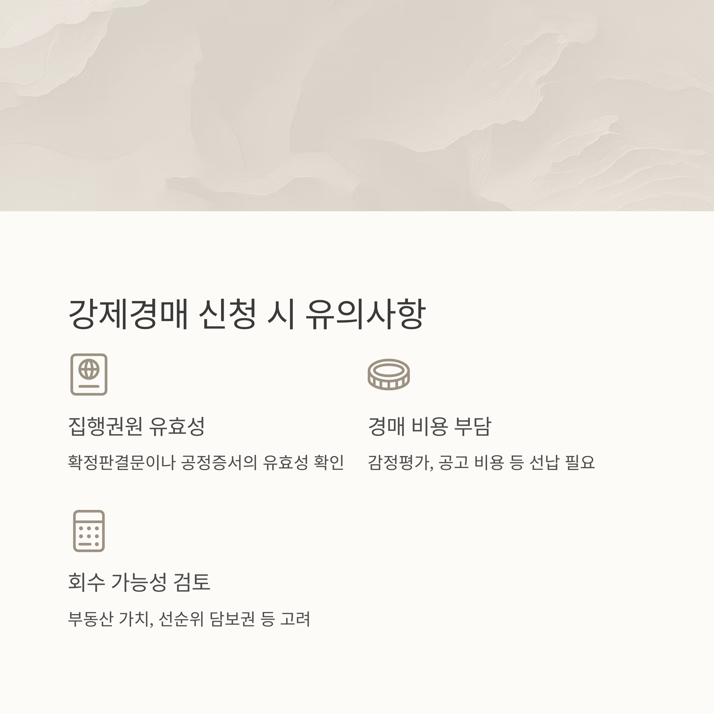 강제경매를 신청할 때는 다음 사항에 유의해야 합니다: