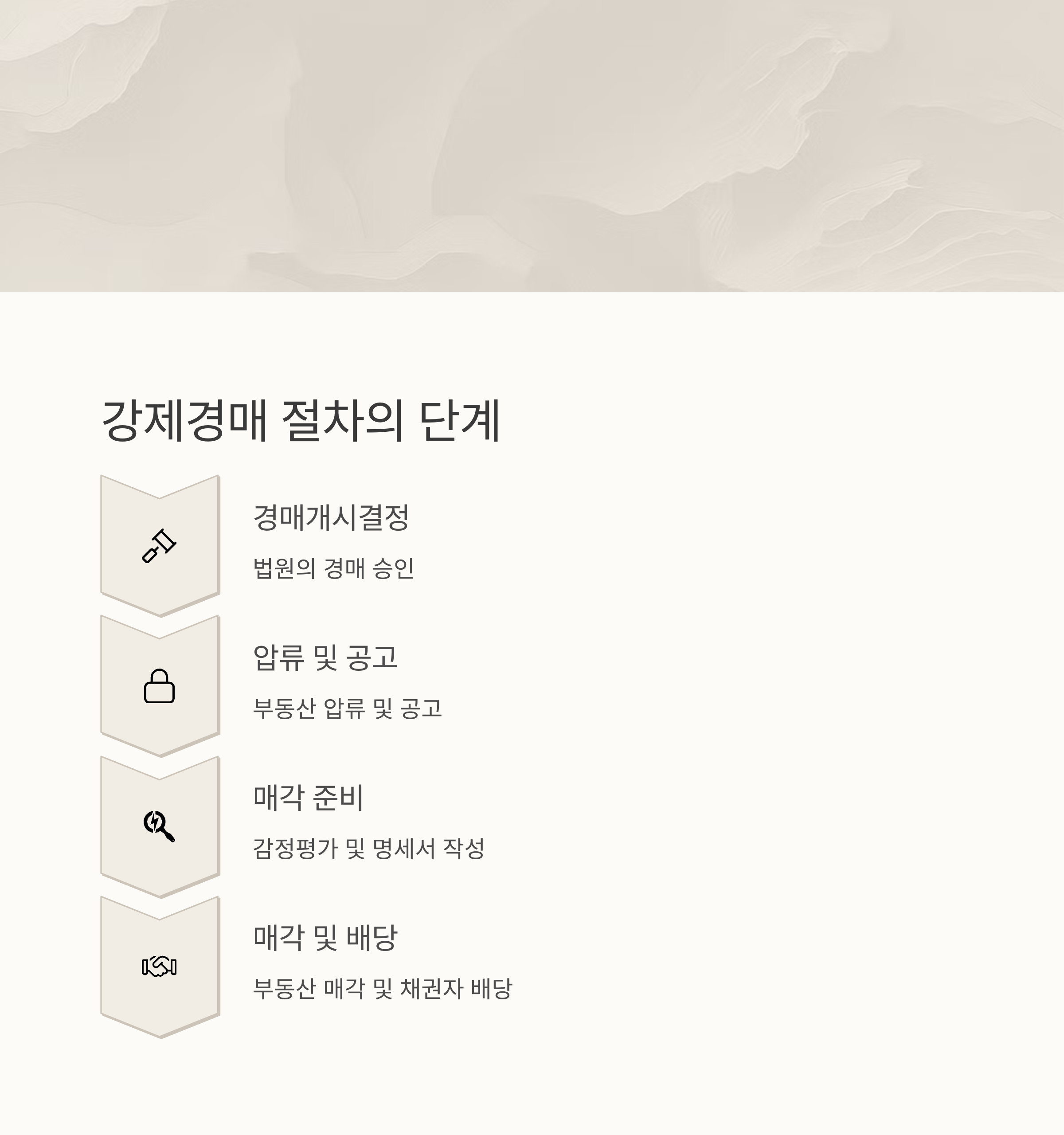 강제경매 절차는 다음과 같은 단계로 진행됩니다: