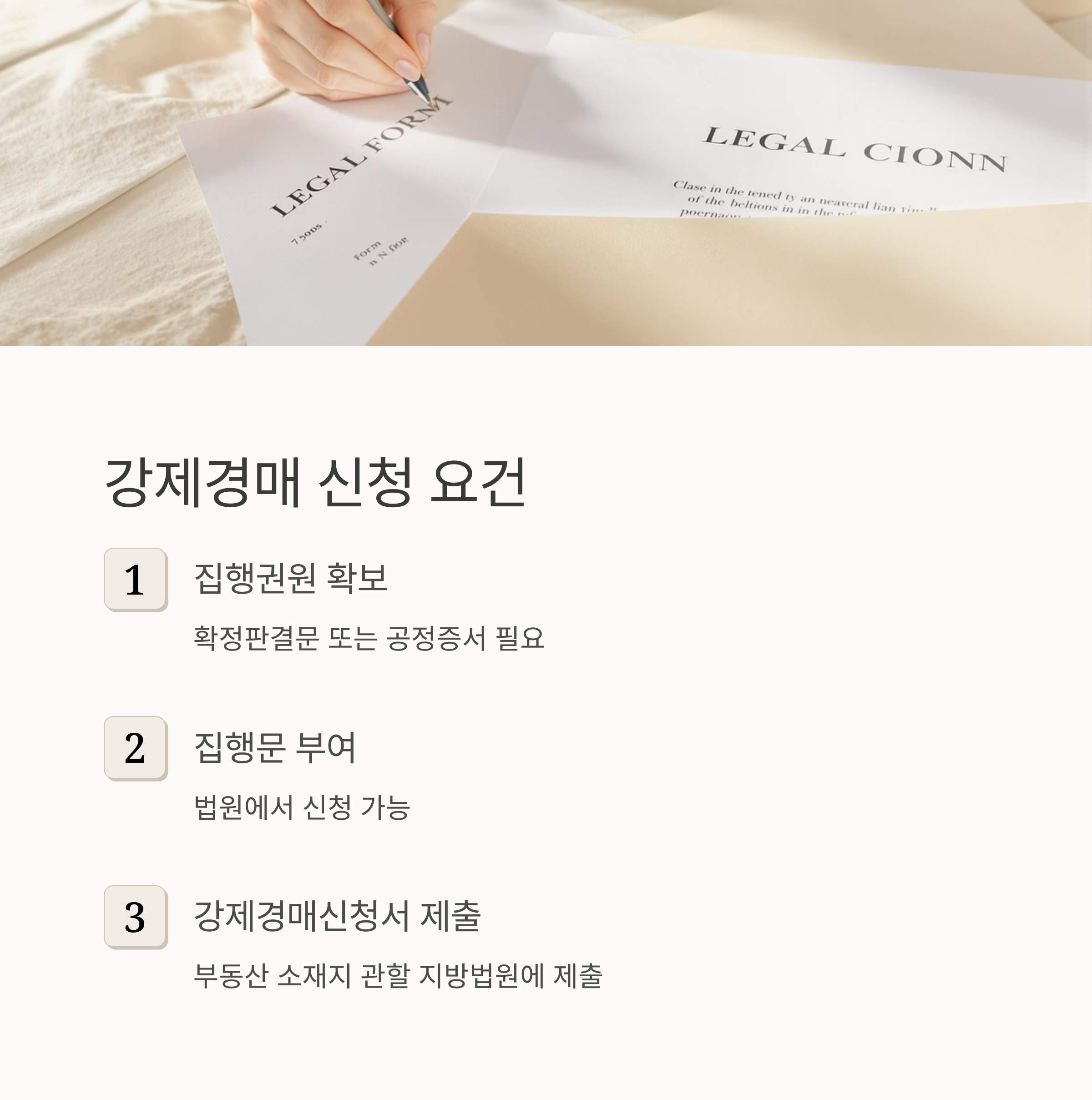 - 필요 서류 첨부: 신청서에는 집행권원의 정본, 부동산 등기사항증명서 등을 첨부해야 합니다.