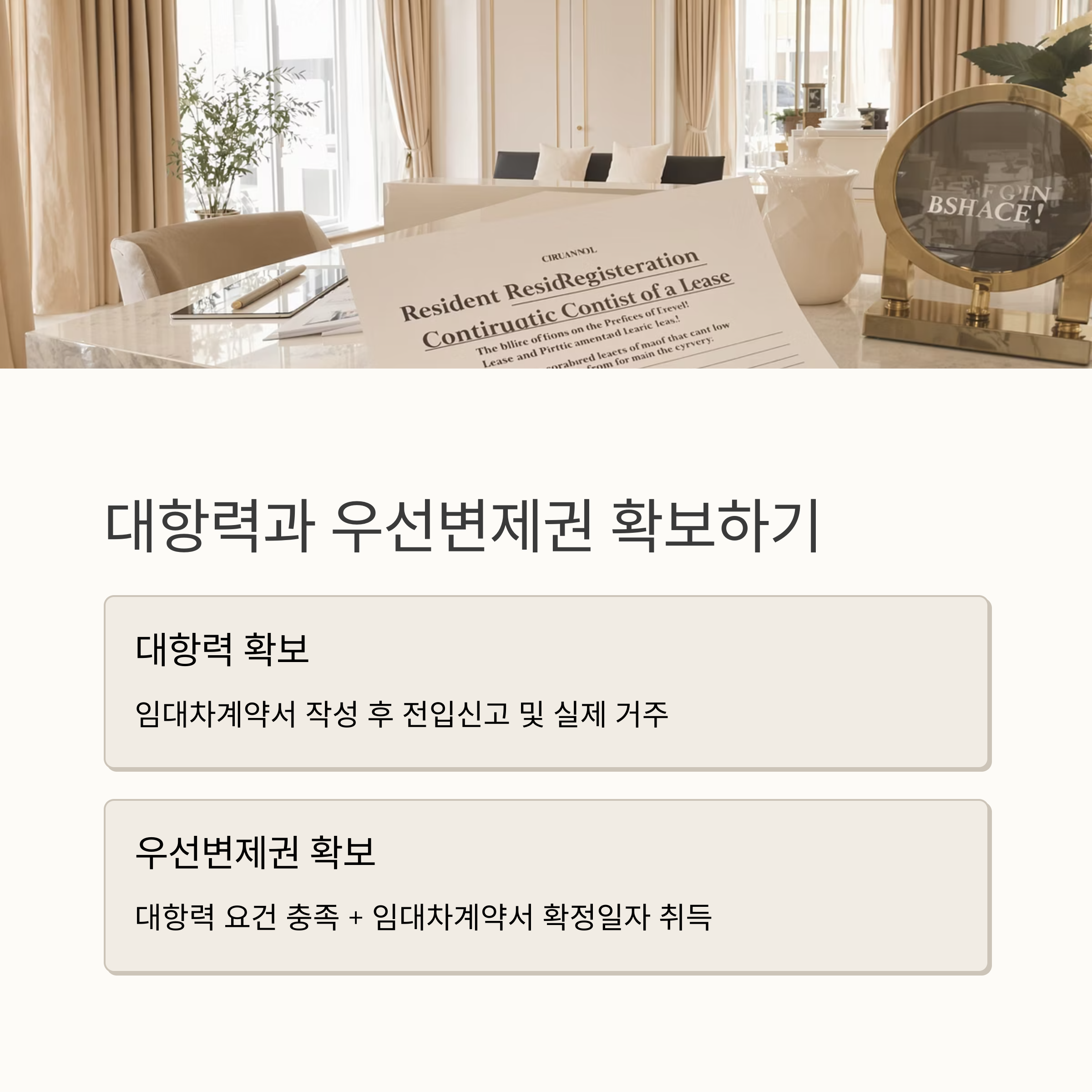 임차인이 보증금을 우선적으로 변제받기 위해서는 대항력과 우선변제권을 확보해야 합니다. 이를 위해서는 다음과 같은 조건을 충족해야 합니다:
