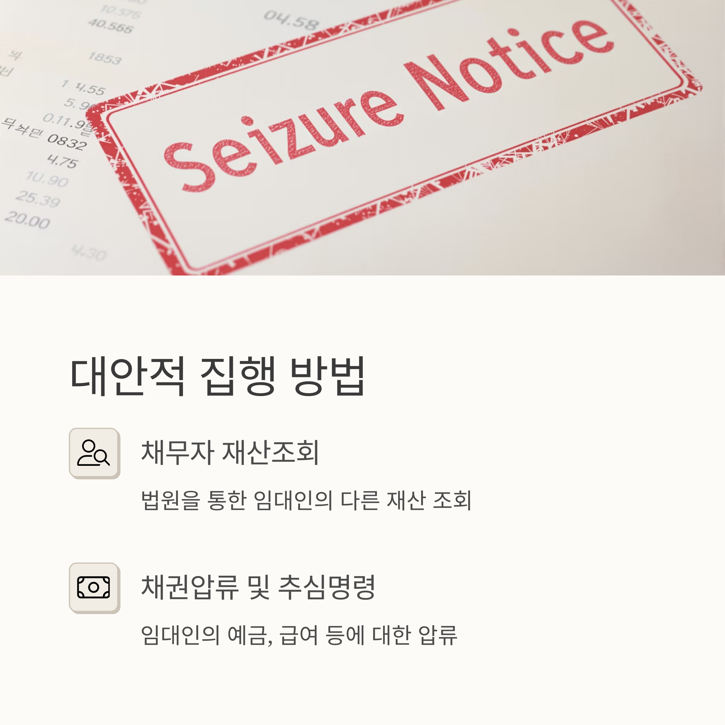 - 채권압류 및 추심명령: 임대인의 예금, 급여 등에 대해 압류 및 추심명령을 신청하여 보증금을 회수할 수 있습니다.