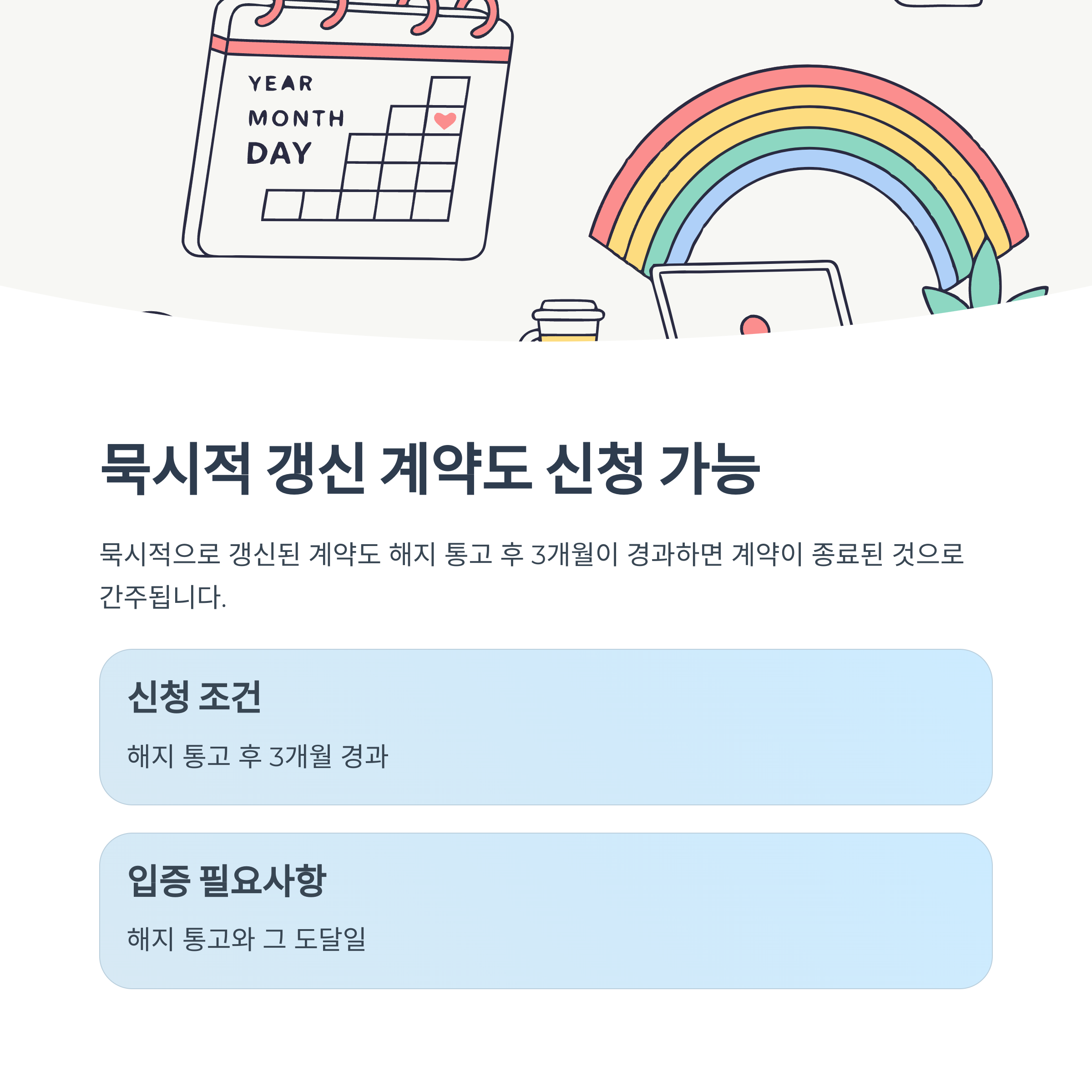 묵시적으로 갱신된 계약도 해지 통고 후 3개월이 경과하면 계약이 종료된 것으로 간주되므로, 이 경우에도 임차권등기명령 신청이 가능합니다. 단, 해지 통고와 그 도달일을 입증할 수 있어야 합니다.