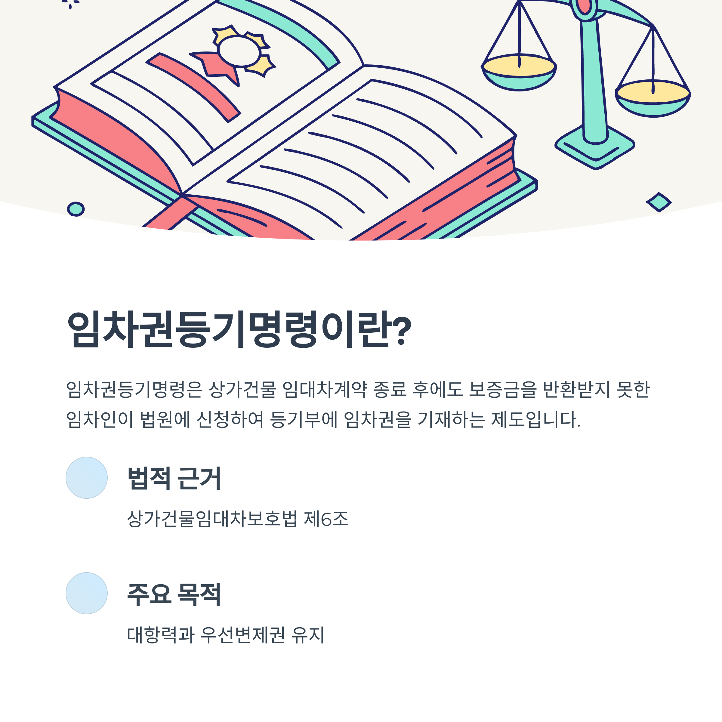 임차권등기명령은 상가건물 임대차계약 종료 후에도 보증금을 반환받지 못한 임차인이 법원에 신청하여 등기부에 임차권을 기재함으로써 대항력과 우선변제권을 유지할 수 있도록 하는 제도입니다. 이는 상가건물임대차보호법 제6조에 근거합니다. 임차인은 이 절차를 통해 자신의 권리를 실질적으로 방어할 수 있습니다.