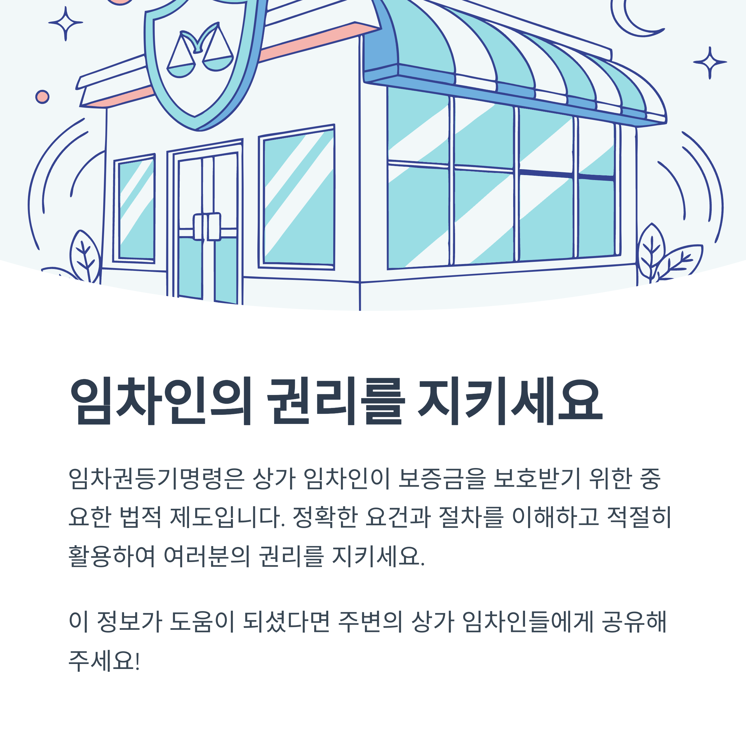임차권등기명령은 상가 임차인이 보증금을 보호받기 위해 활용할 수 있는 법적 제도입니다. 정확한 요건과 절차를 이해하고, 상황에 따라 적절히 활용한다면 보증금 회수와 권리 보호에 실질적인 도움이 될 수 있습니다.