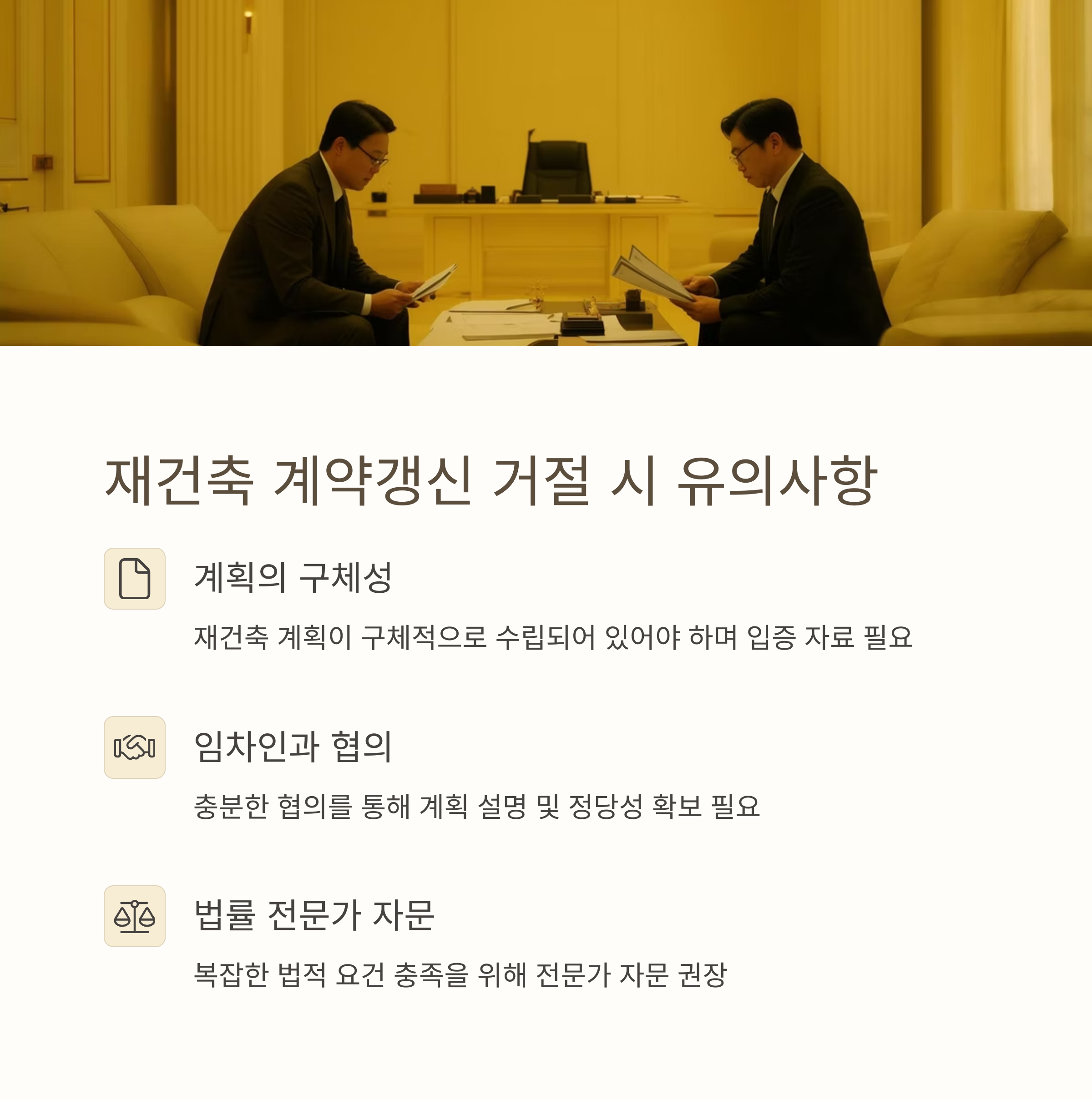 - 임차인과의 협의: 임차인과의 충분한 협의를 통해 재건축 계획을 설명하고, 계약갱신 거절의 정당성을 확보해야 합니다.