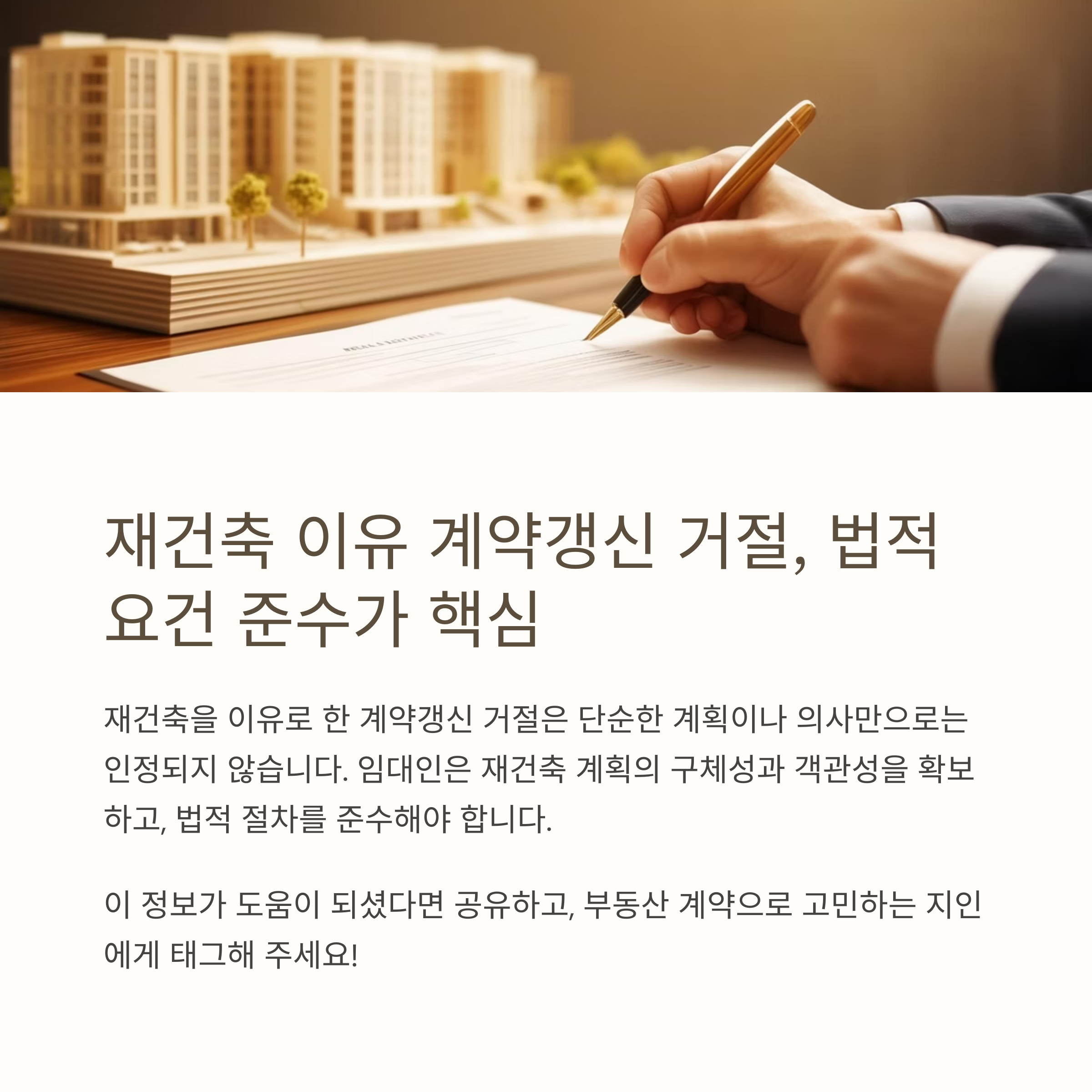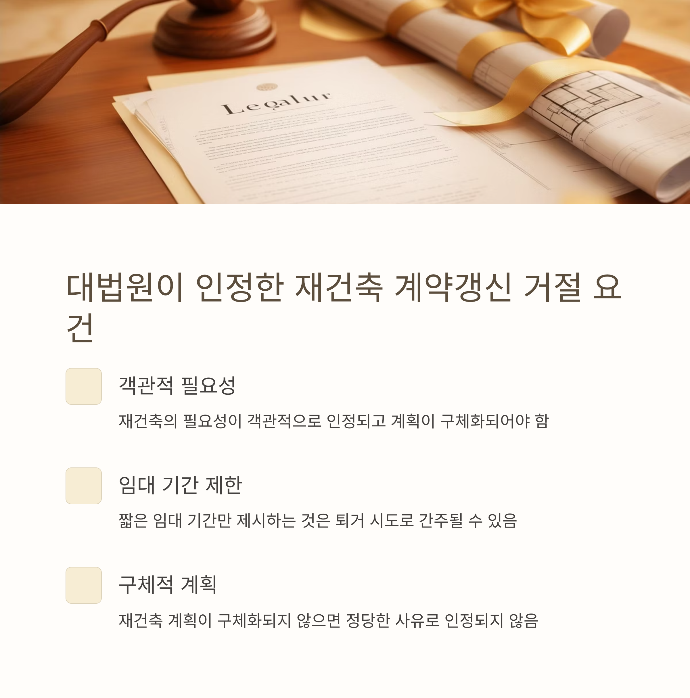 이러한 요건을 충족하지 못하면 재건축을 이유로 한 계약갱신 거절은 법적으로 인정되지 않을 수 있습니다.