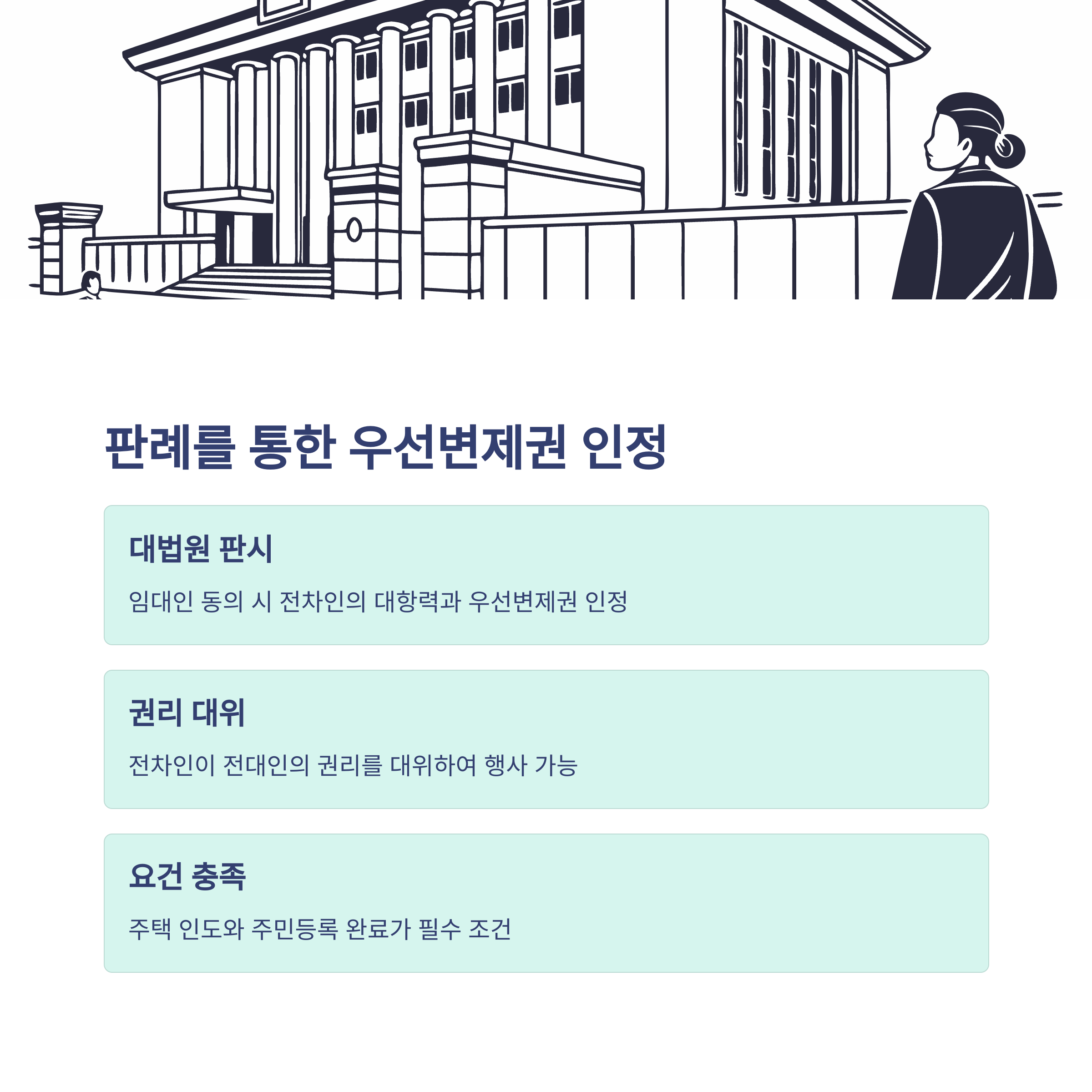 전차인이 대항력을 취득하려면 주택의 인도와 주민등록을 마쳐야 합니다. 우선변제권을 행사하기 위해서는 대항력 취득 외에도 확정일자를 받아야 합니다. 이러한 요건을 충족하면 전차인은 전대인의 지위를 대위하여 우선변제권을 행사할 수 있습니다.