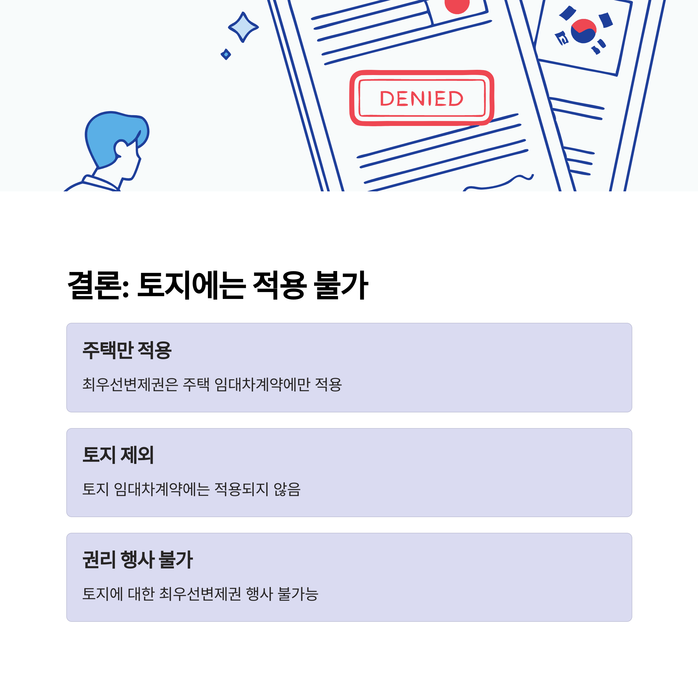 대법원은 주택임대차보호법의 적용 범위를 주택으로 한정하고 있으며, 토지에 대한 임대차는 보호 대상이 아니라고 판시한 바 있습니다. 따라서 토지에 대한 임대차계약에서는 최우선변제권을 행사할 수 없습니다.