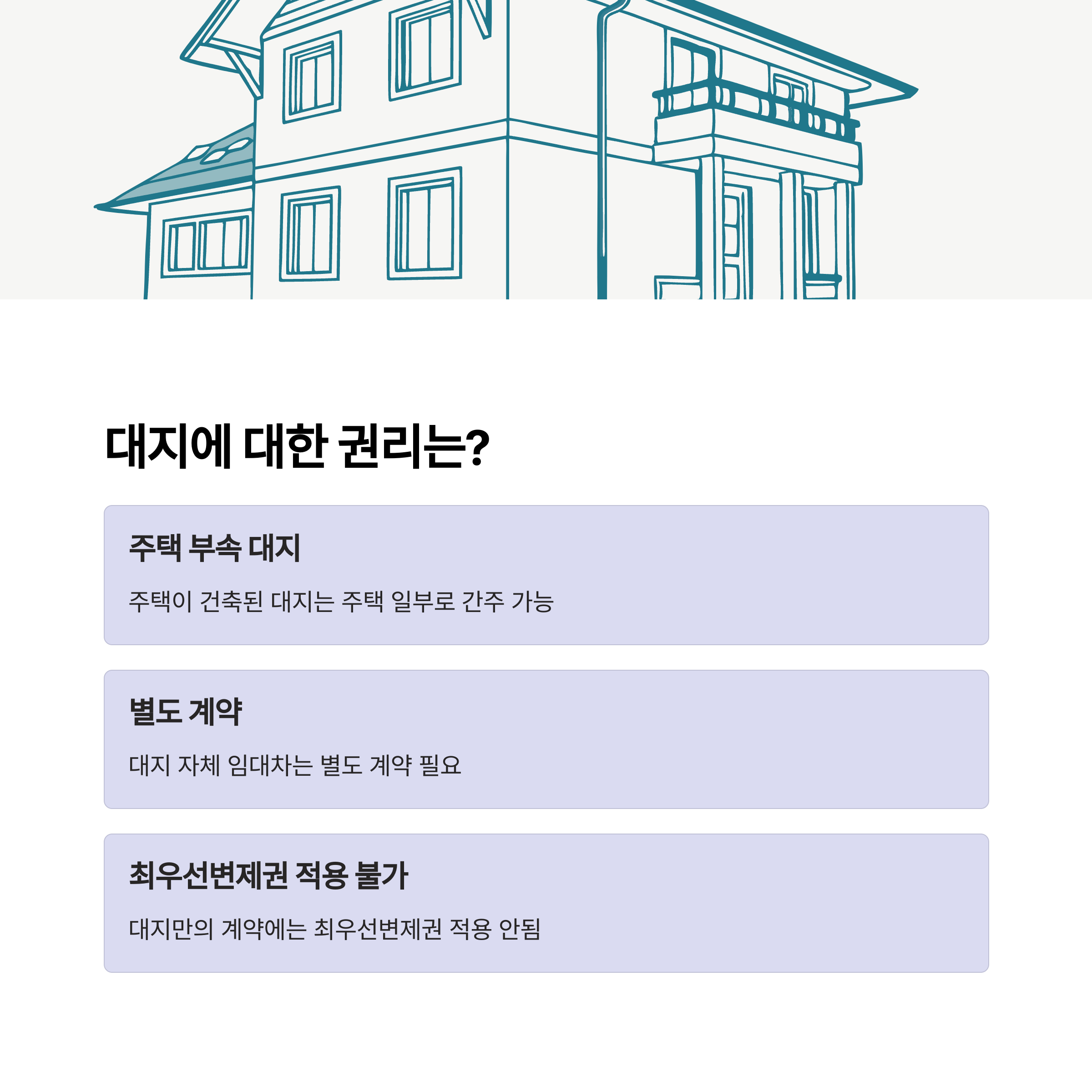 주택이 건축된 대지는 주택의 일부로 간주되어 주택임대차보호법의 보호를 받을 수 있습니다. 그러나 대지 자체에 대한 임대차계약은 별도로 체결되어야 하며, 이 경우에도 최우선변제권은 적용되지 않습니다.